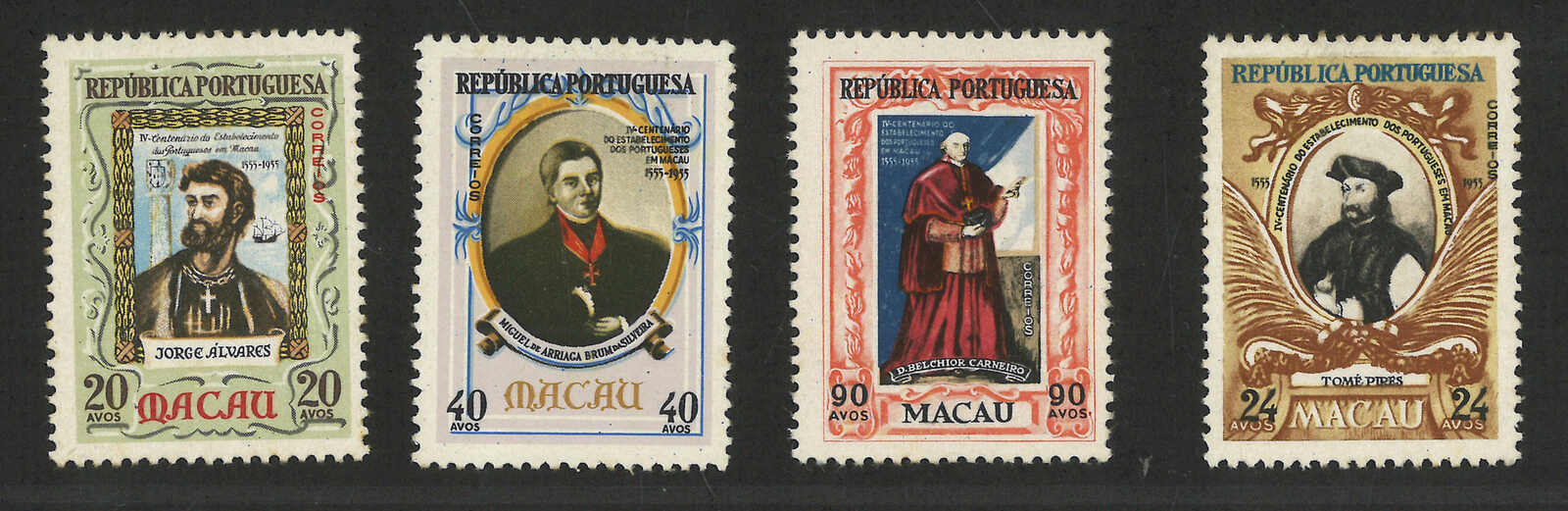 1955年未發行之葡萄牙人在澳門四百週年新全(楊目U4),原膠背貼,背帶微黃點。當時澳葡政府籌備了一連串紀念葡萄牙人創建澳門城市四百週年之活動,以鞏固葡萄牙在澳門的地位,但遭到新中國政府強烈反對,最終除了賽車外所有慶祝活動,連同此郵票均被取消。詳見《澳門郵博 02/2025》。(Image 1)