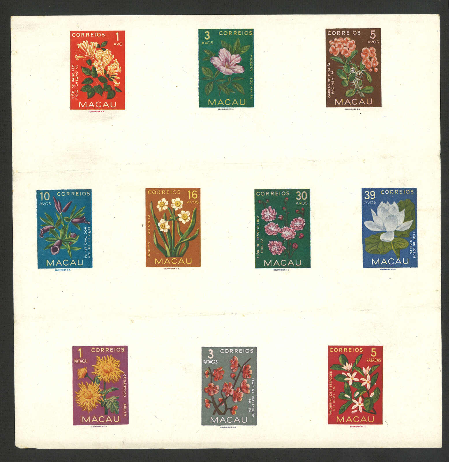 1953 Macau Indigenous Flower imperf die proof sheet (Yang 387-396). With folds and light creases.