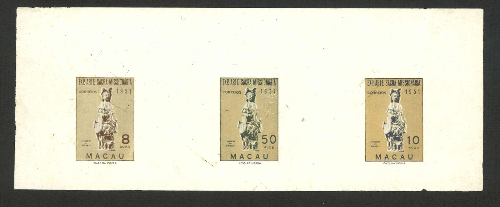 1953 Macau Missionary Art Exhibition imperf die proof on sheet (Yang C384-386). F-VF.