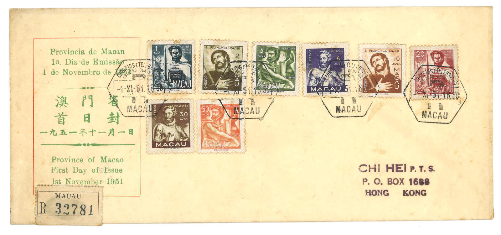 1951 (1 Nov) Macau Various Protrait official FDC (Yang 368-375), f.w. complete set of 8, tied by Macau hexgonal d.s, alongside with regstered label. Rare illustrative FDC.