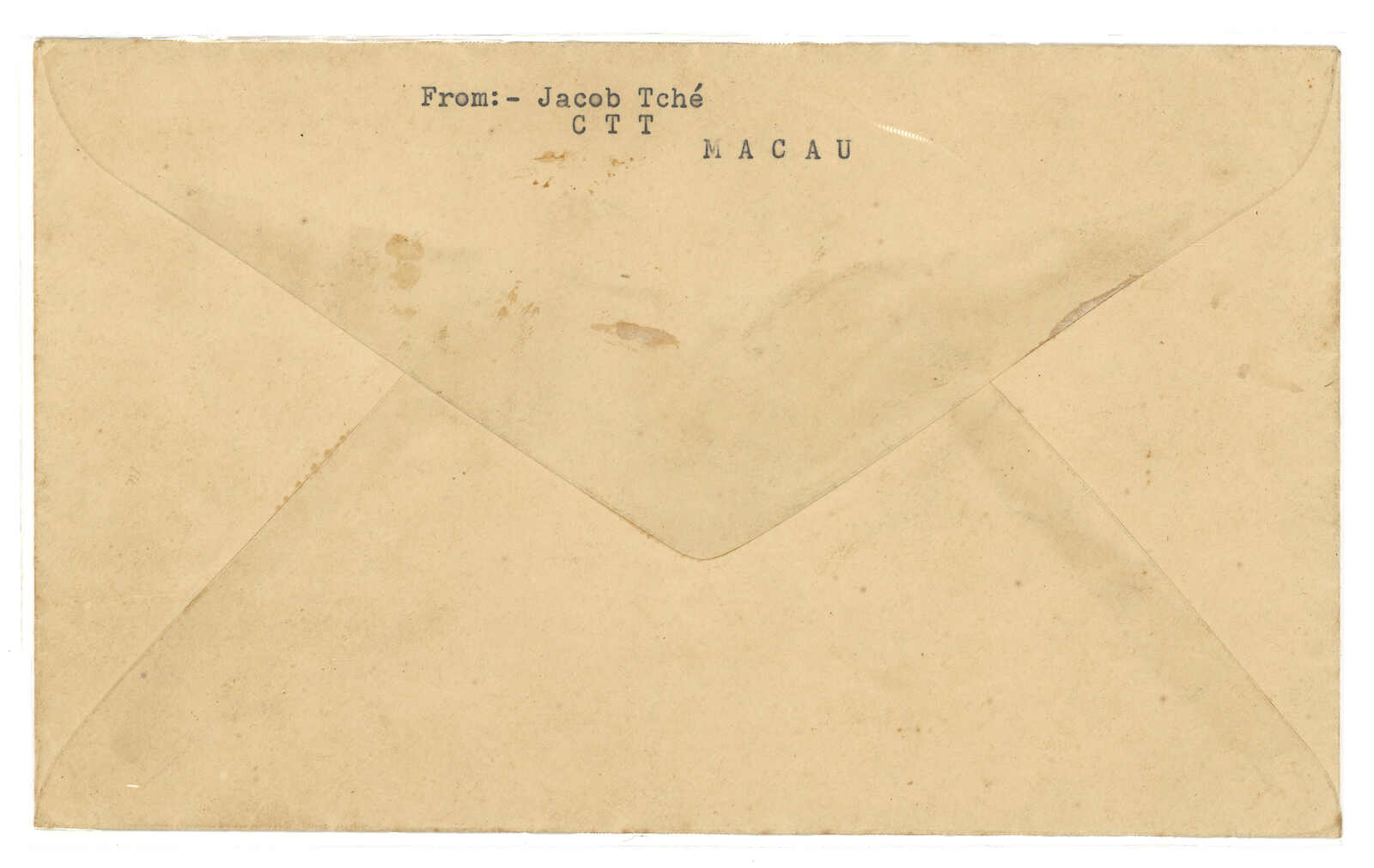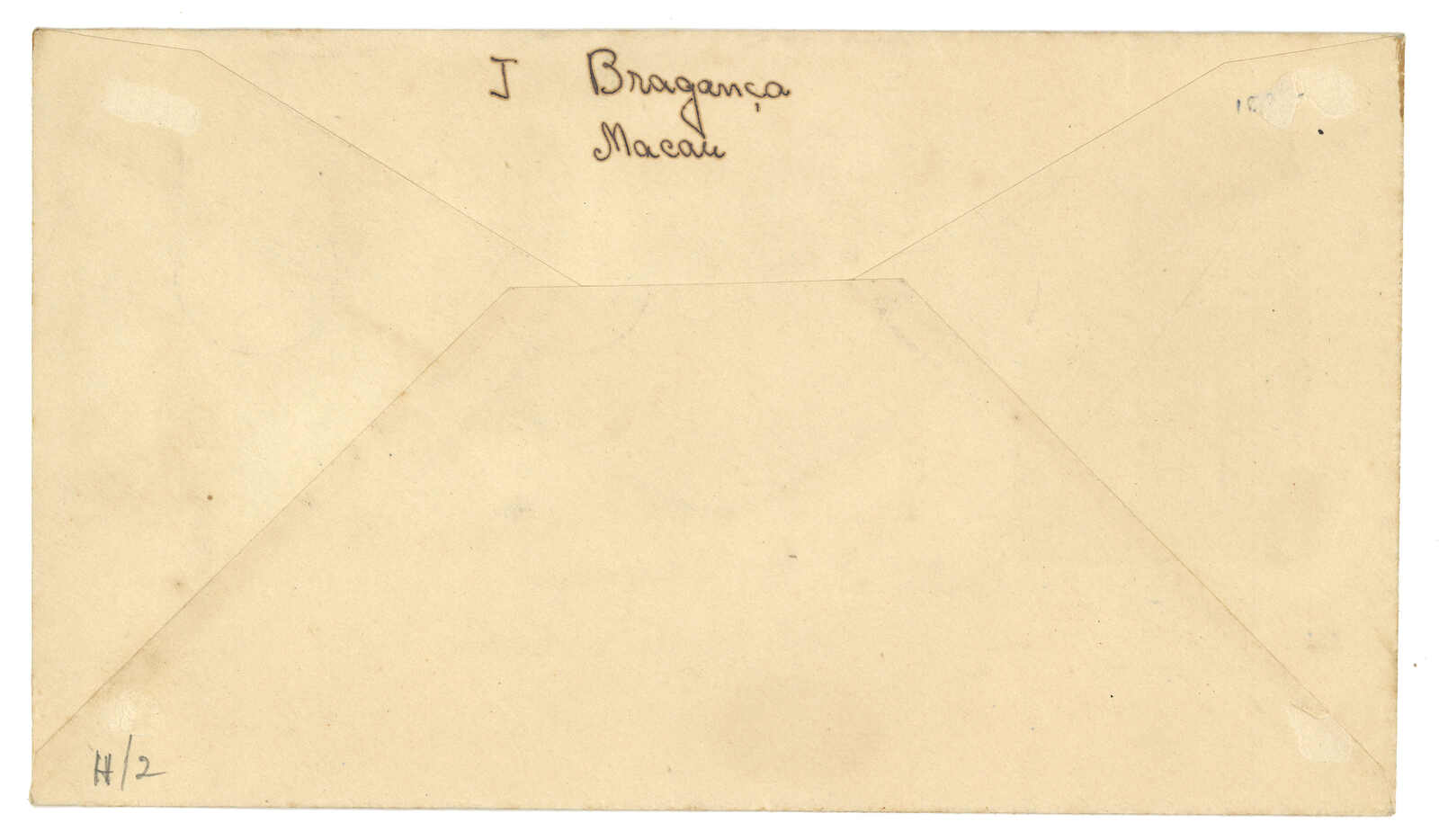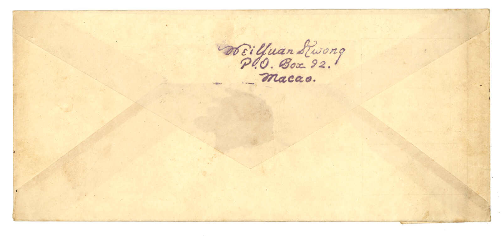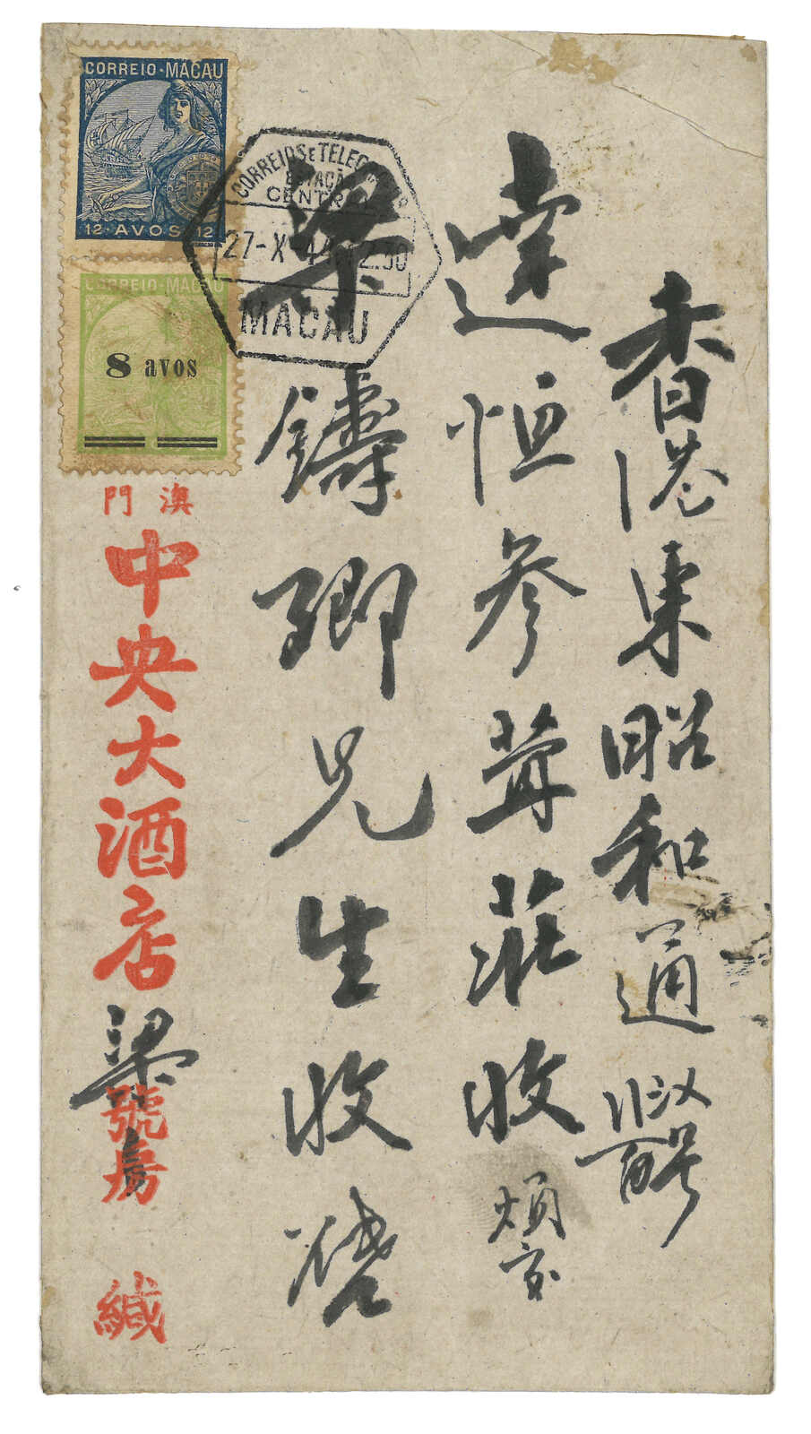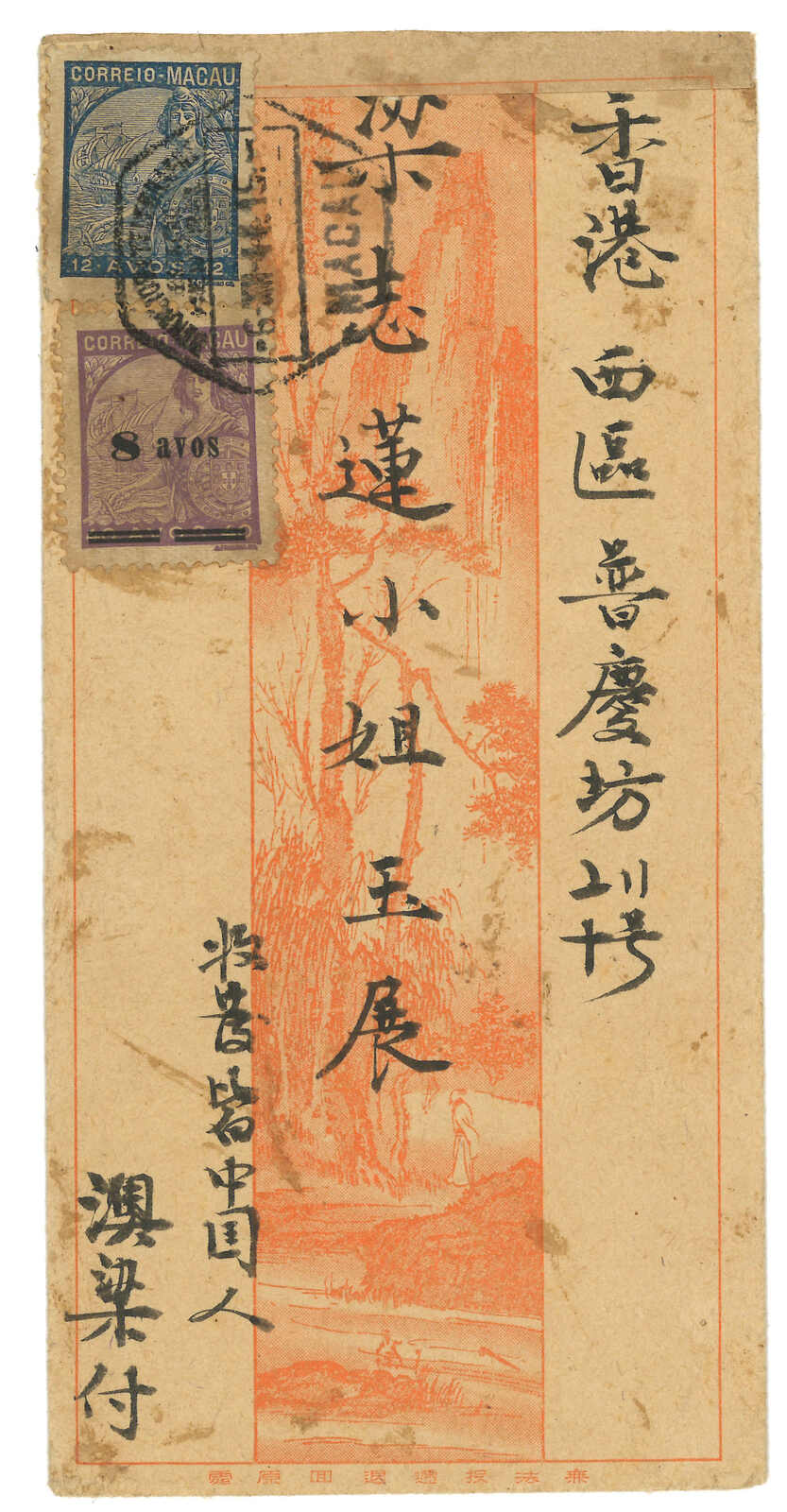 1944 Macao (6 Dec) to Hong Kong, f.w. San Gabriel unovpt. 12a + surch double line 8a/30a (Yang 325), tied by hexagonal d.s.