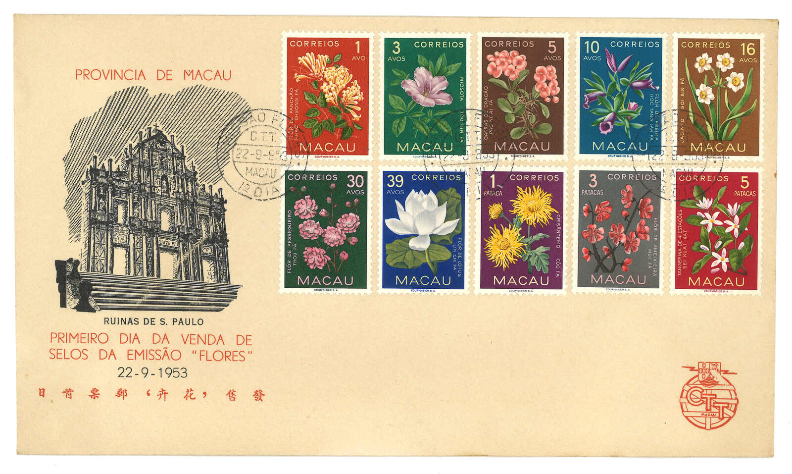 1953 (22 Sep) Macau Indigenous Flower official FDC (Yang 387-396), f.w. complete set of 8, tied by Emissao Flores commemorative cdss.