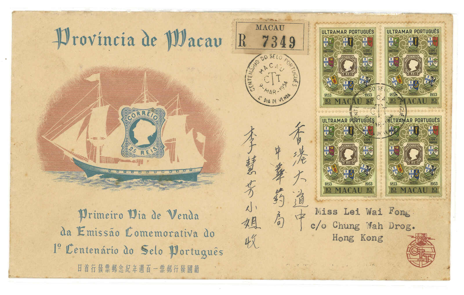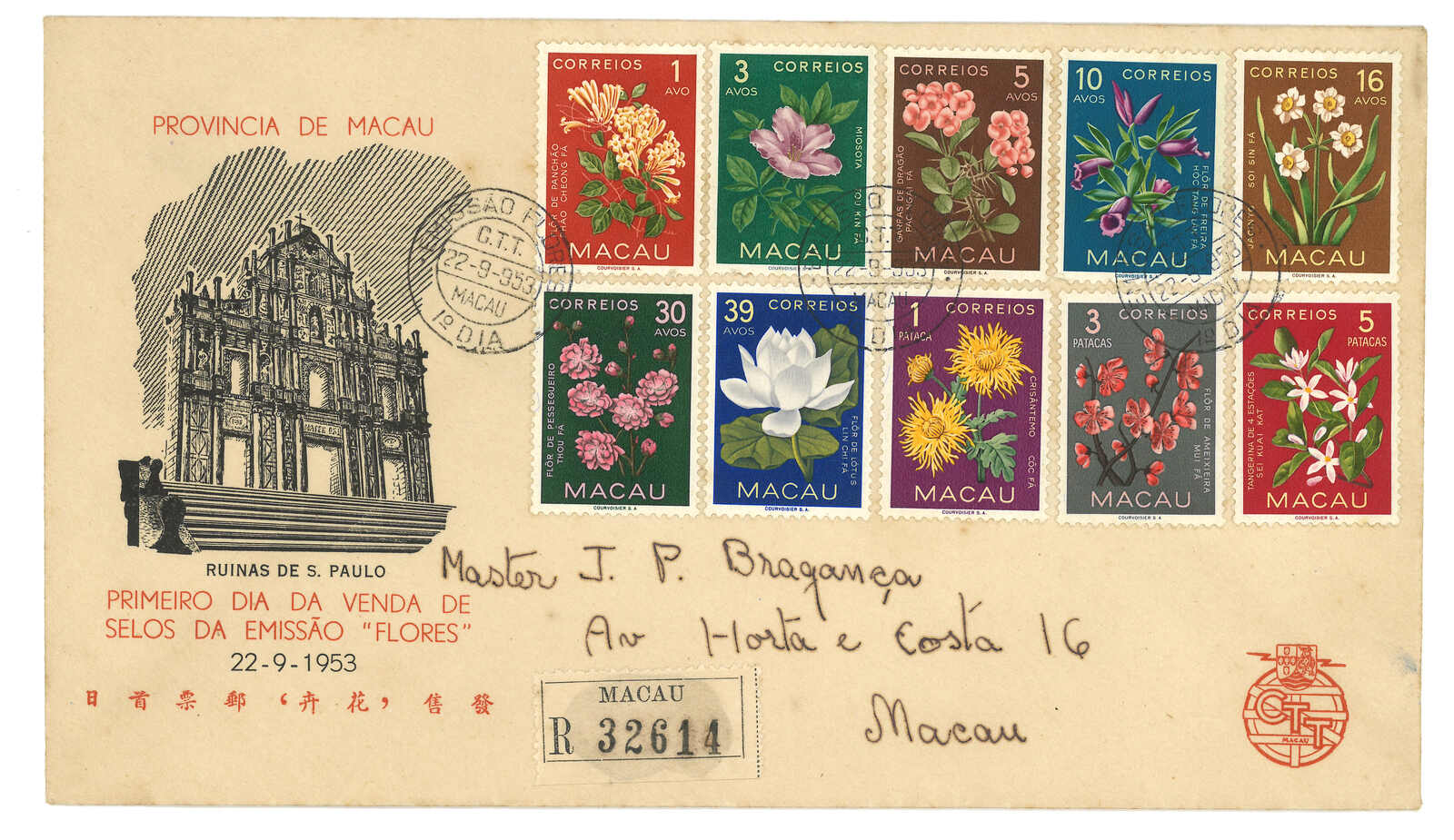 1953年澳門花奔美術首日封(楊目387-396),貼10枚全,銷首日紀念日戳,旁貼掛號標籤。(Image 1)