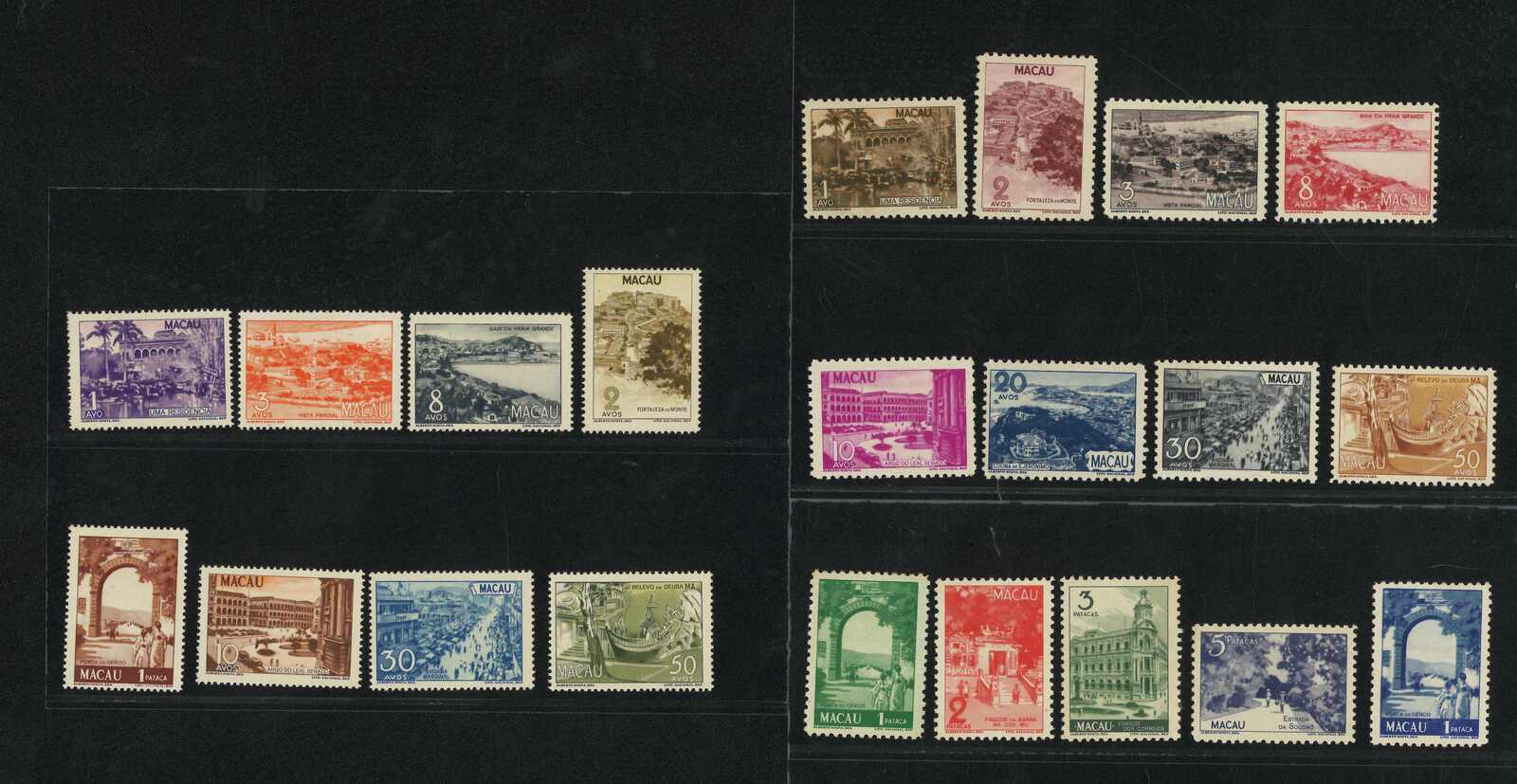 1948至1951年澳門風景郵票第一組及第二組新全,當中包含關鍵之藍關閘1元(楊目339-363),背貼。(Image 1)