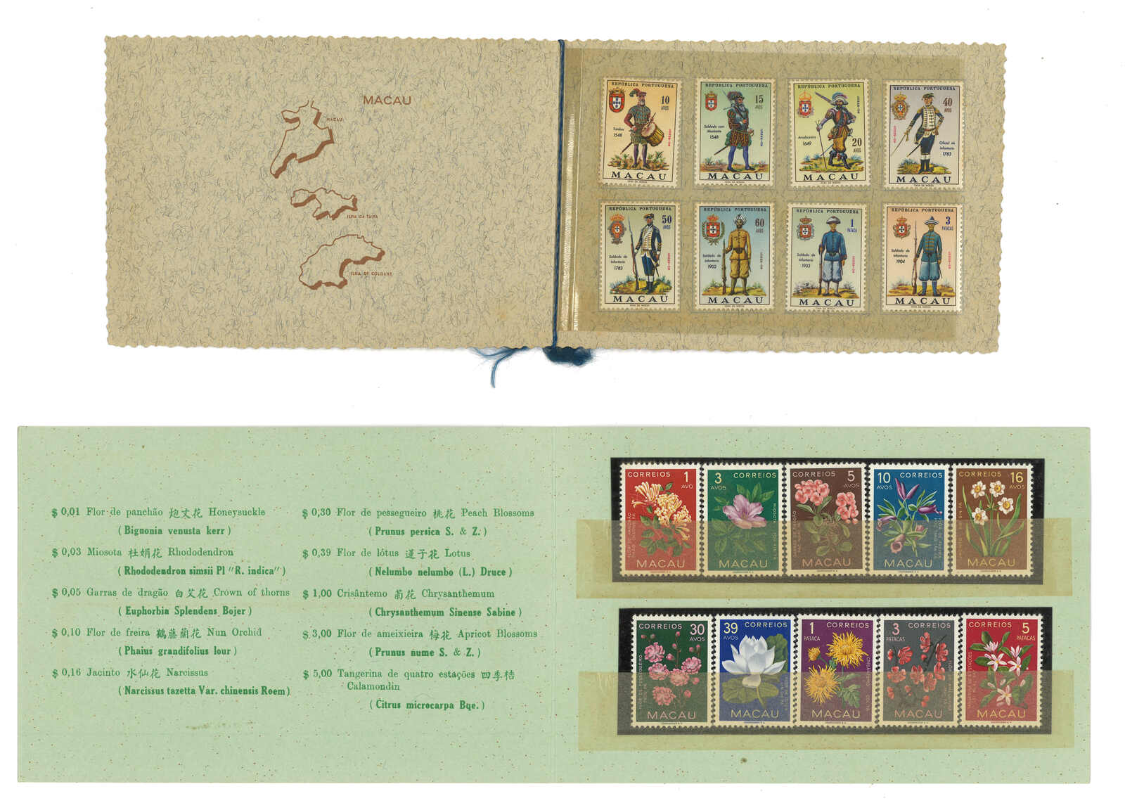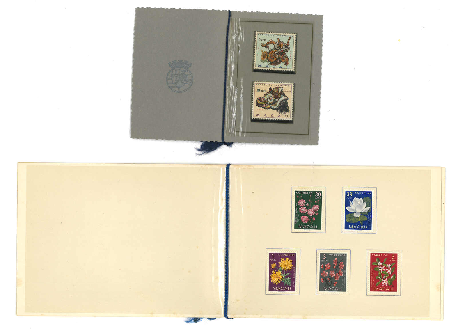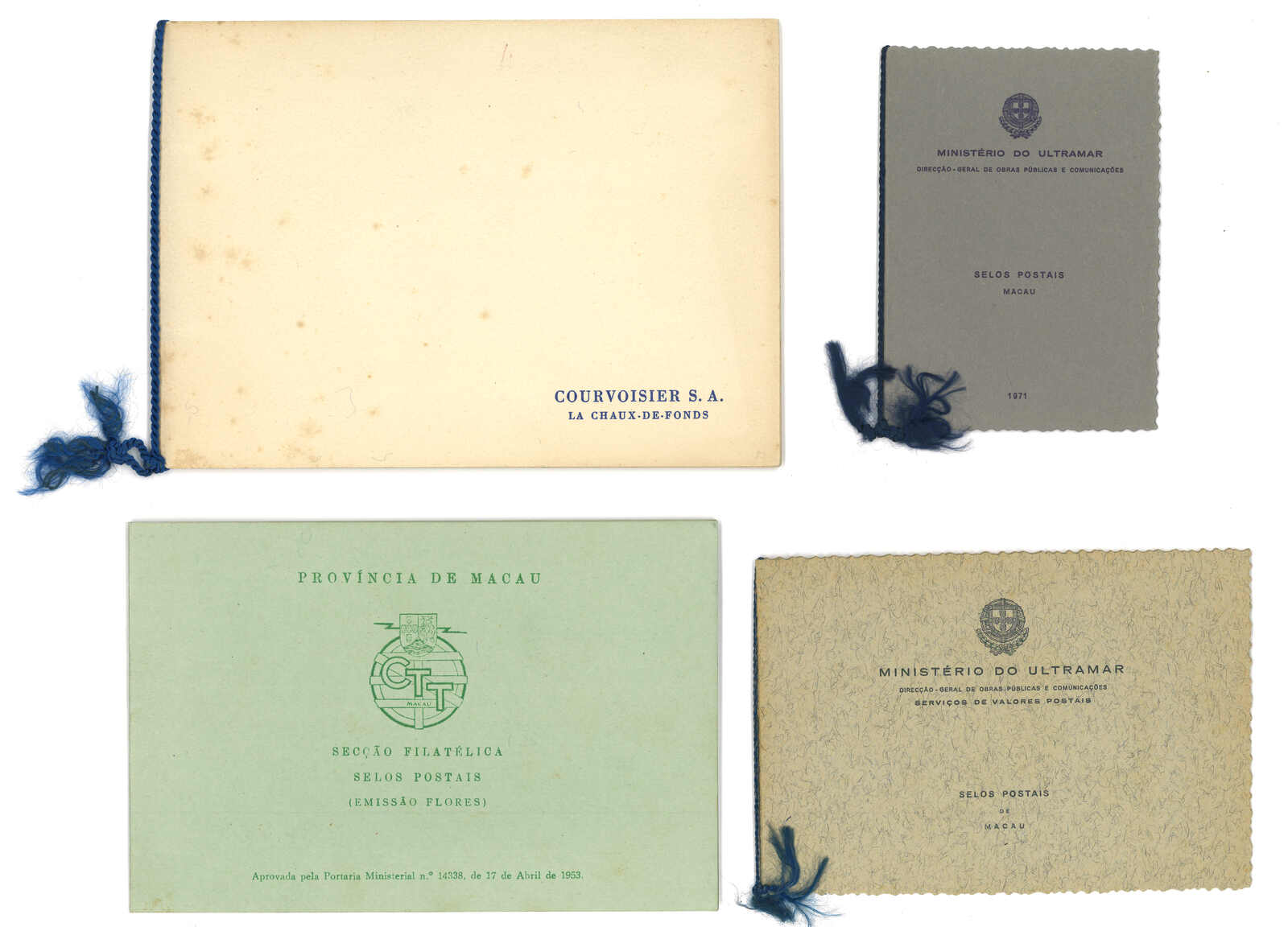 1953-1971 a group of 4 Macau stamp presentation folders, including Indigenous Flowers x2, military uniform and Chinese Carnivla Masks.