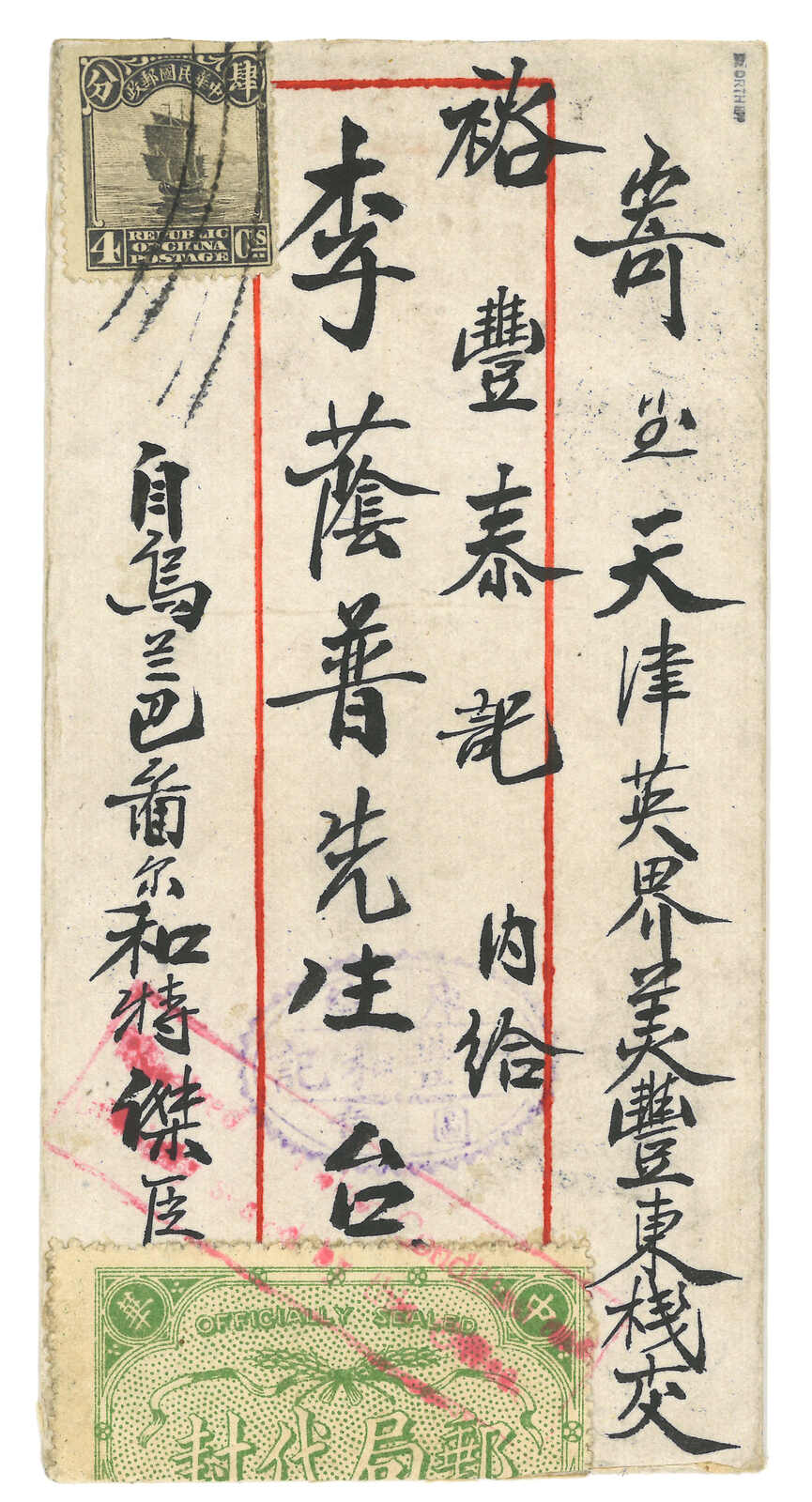 1926.6.9 烏蘭巴托寄天津。中式封,背貼印花稅票紫色加蓋“POSTAGE”5分 + 20分,銷烏蘭巴托日戳。貼中華郵政破損重封標籤。6.24抵天津。極少見貼用代封之蒙古進口封,可能為孤品。(Image 1) (Image 2)