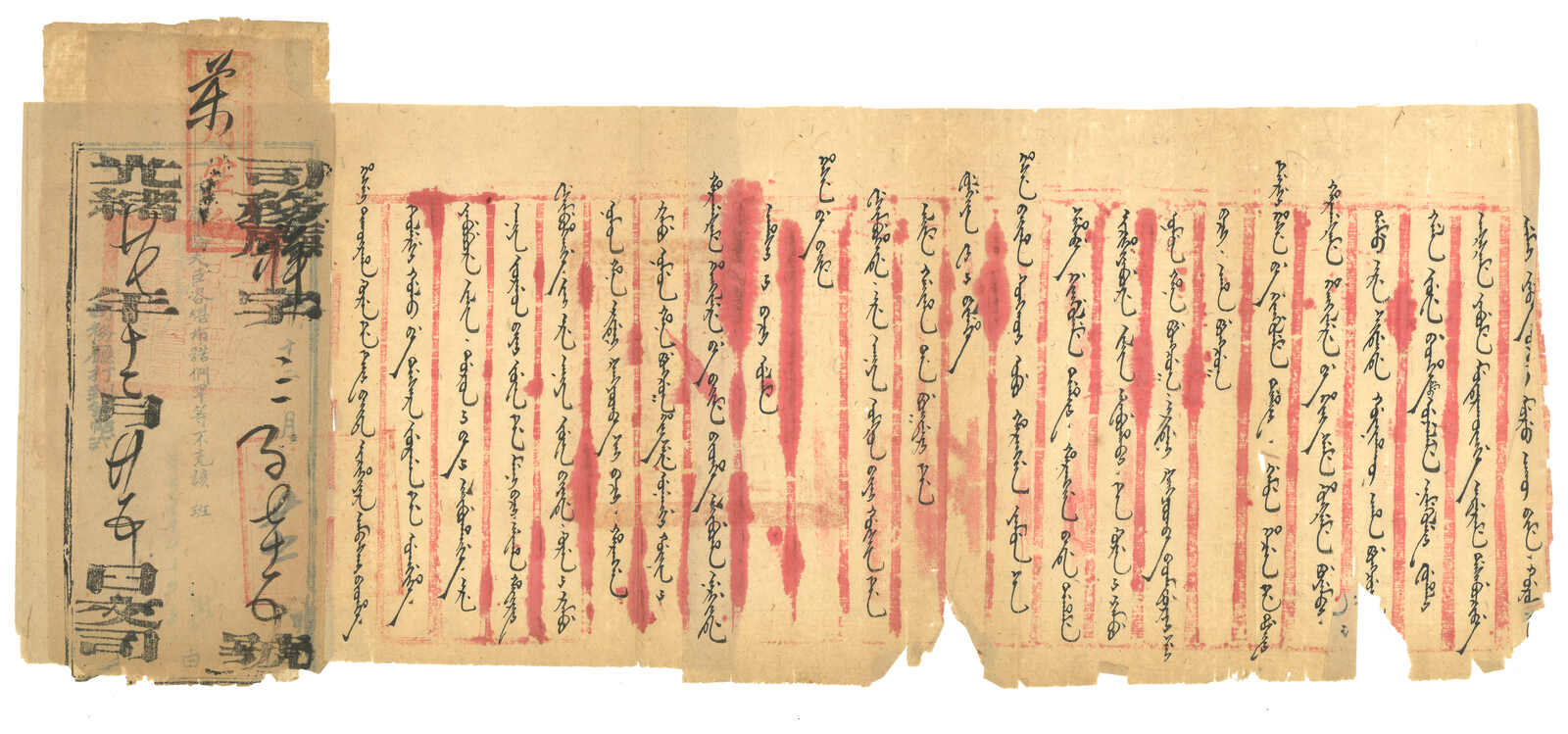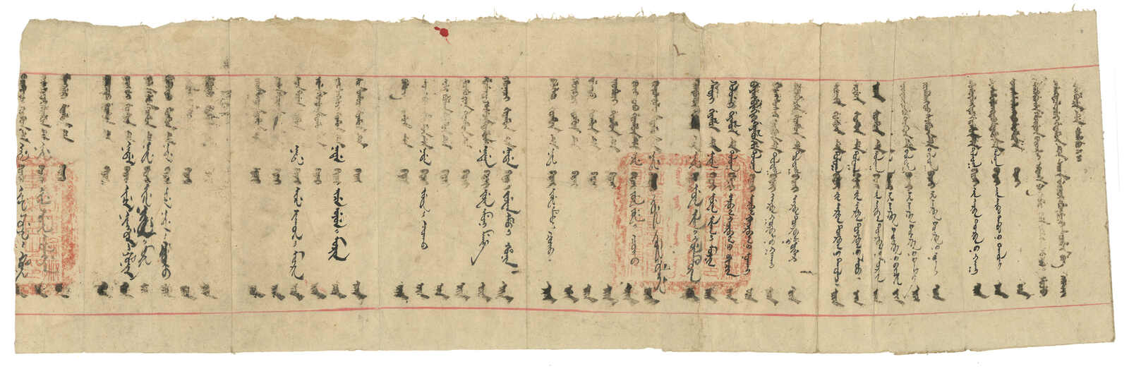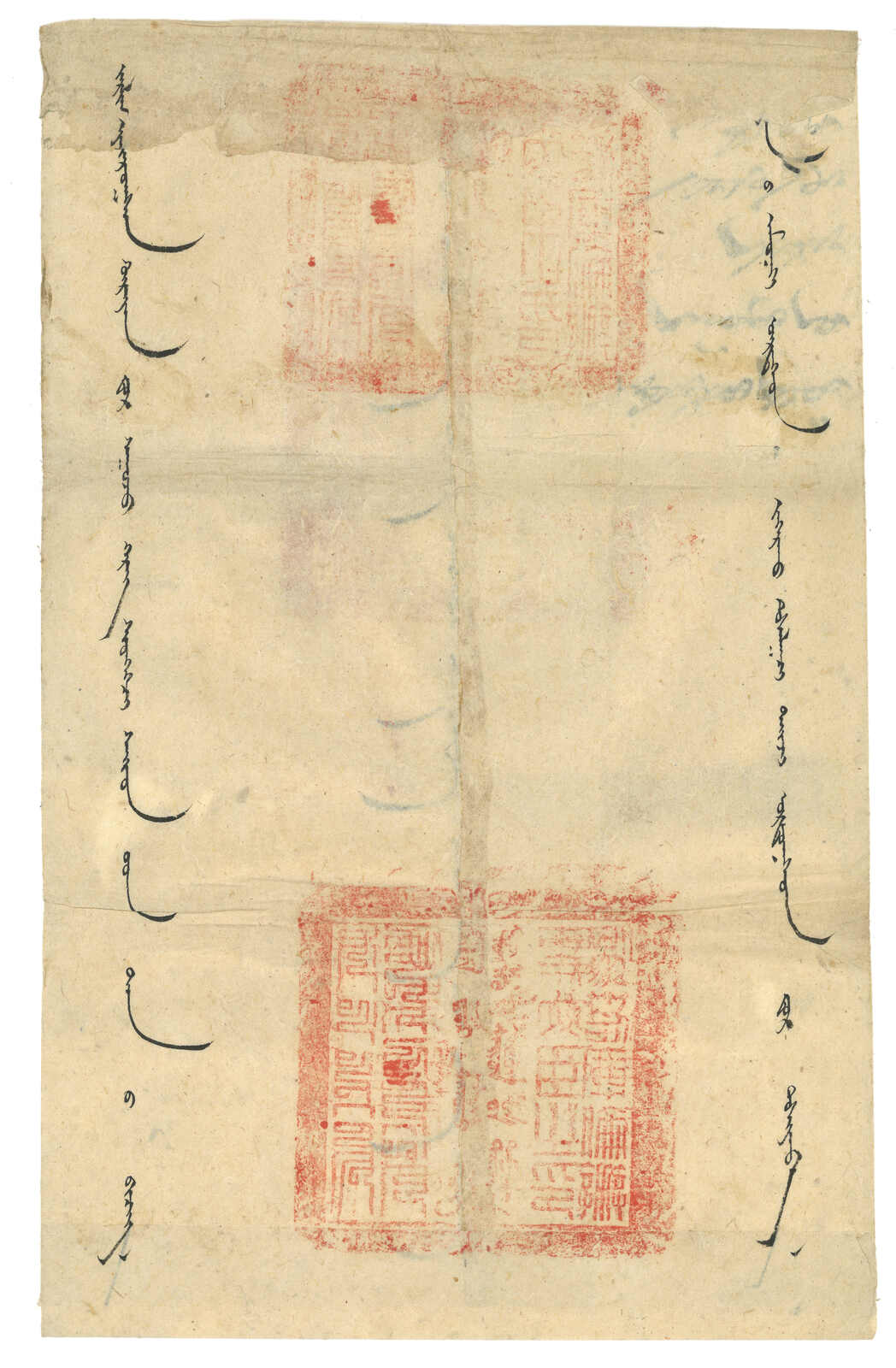 1909.8.26 蒙古大喇嘛致王公公函,鈐大印三方。分別在於蒙古喇嘛官印用藏文滿文, 王公官印用滿文蒙文, 只有品秩高的喇嘛才配持有官印,十分珍罕。(Image 1) (Image 2)