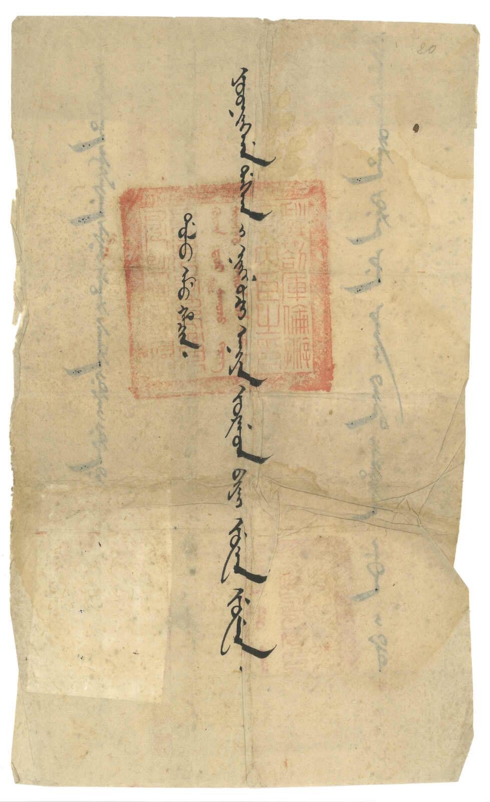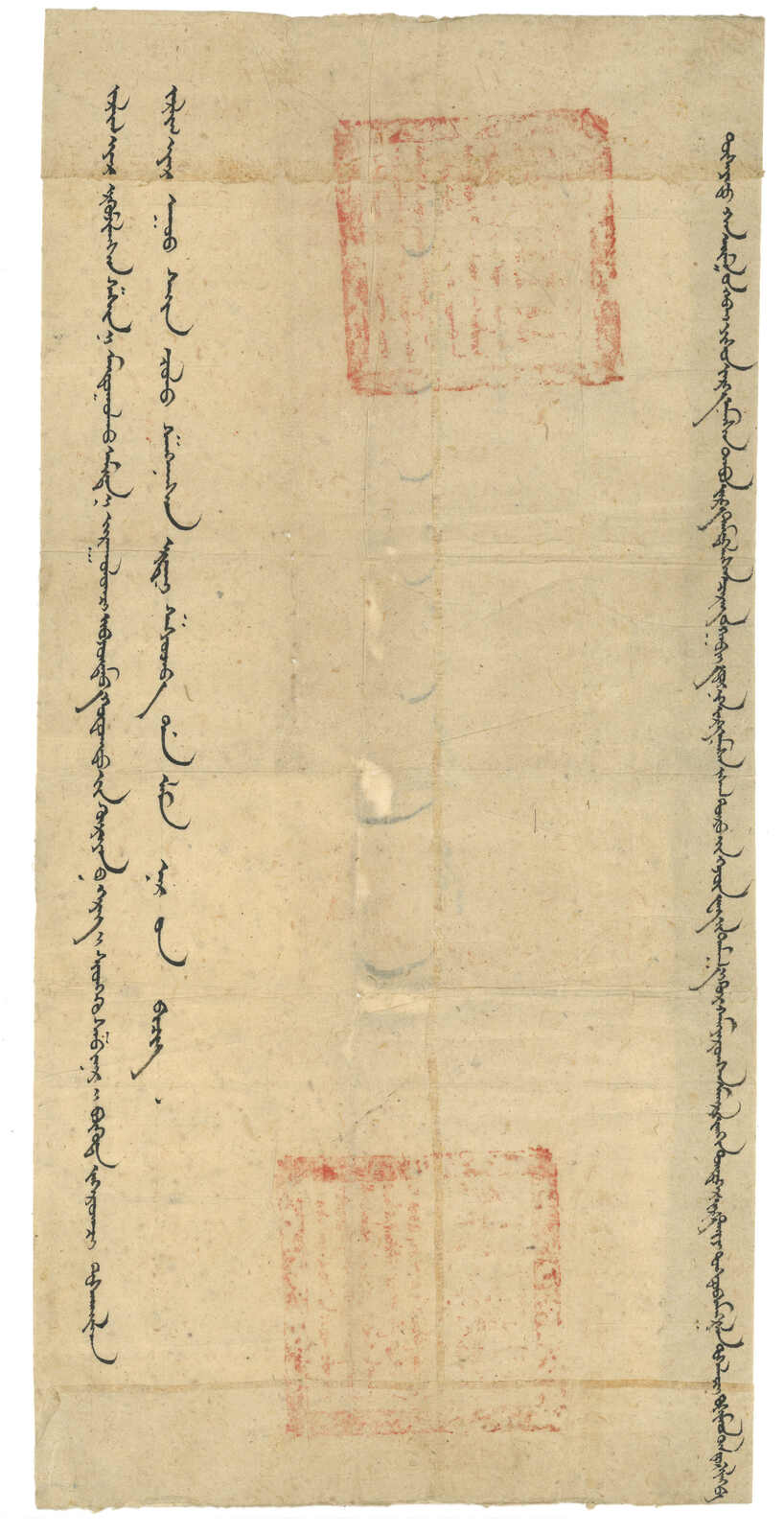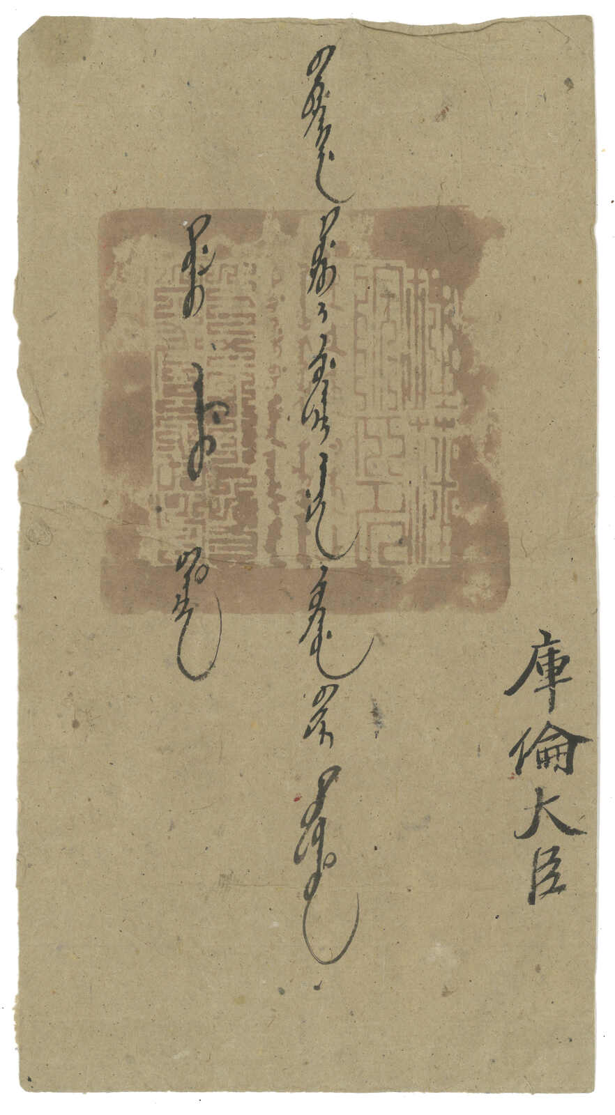 乾隆六十年(1795)大型公文封,鈐庫倫大臣紅色官印。該印為長形而非方形,可見當時庫倫大臣權力仍有限。(Image 1) (Image 2)