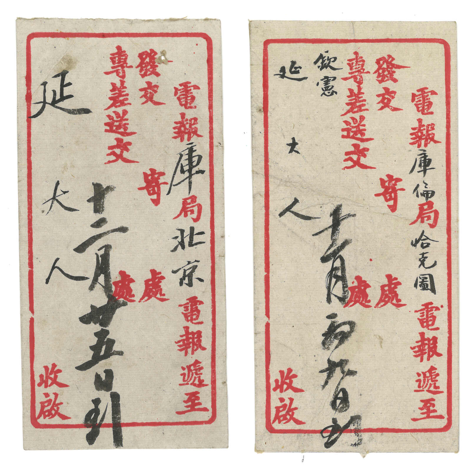 約1908年一對預印電報封,由恰克圖及北京寄庫倫大臣,反映北京與西伯利亞間已可進行電信。難得。(Image 1) (Image 2)