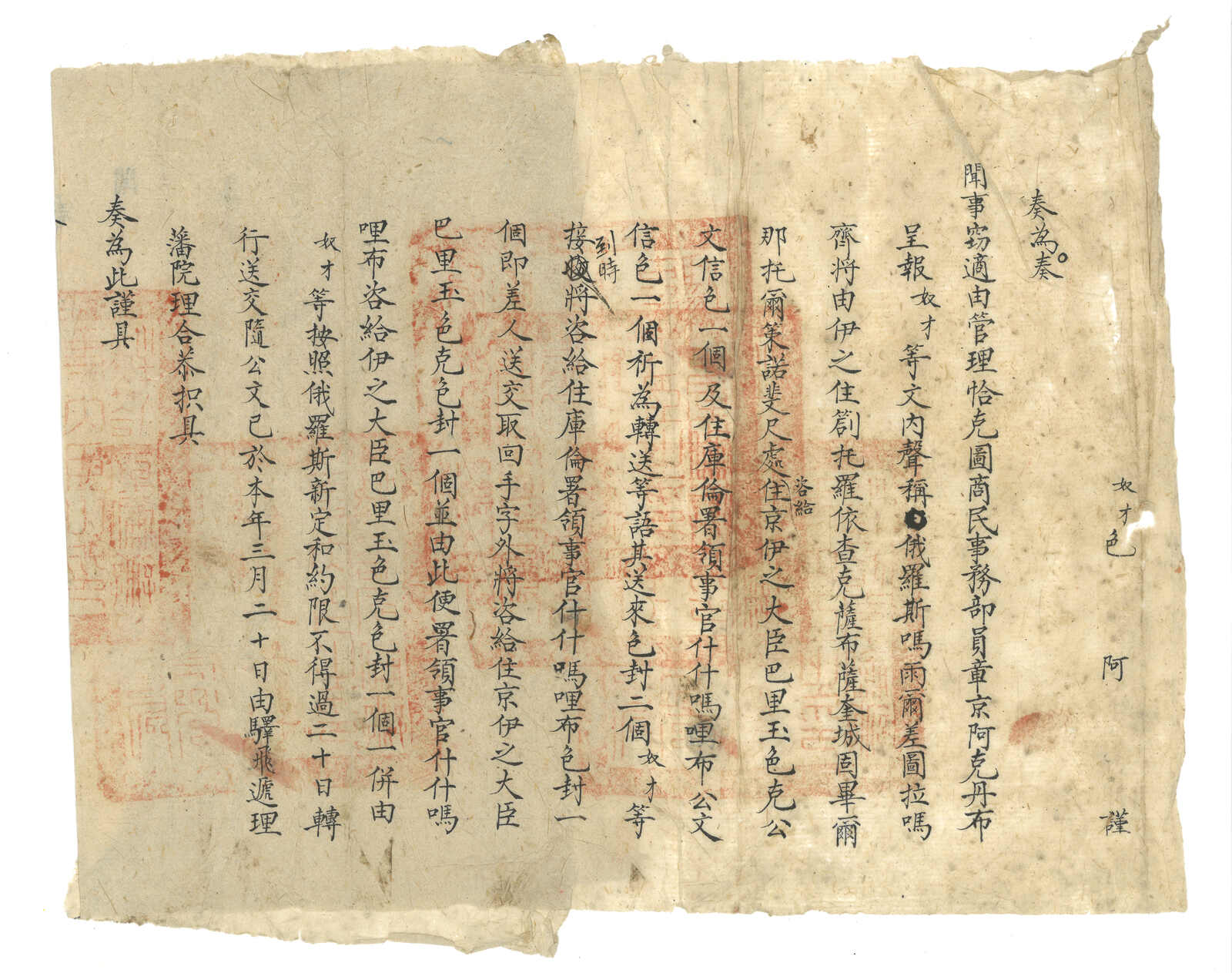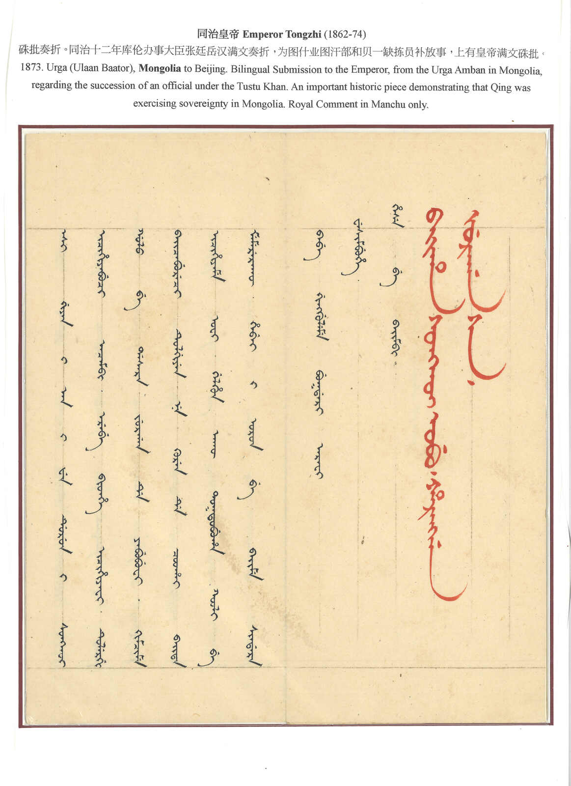同治十二年(1873)庫倫大臣張廷岳之滿文漢文奏折,為圖什業圖汗部和貝一缺揀員補放事,反映清朝對蒙古的管治。Hellrigl著《The Postal History of Mongolia 1841-1941》第249頁圖188原件。(Image 1)