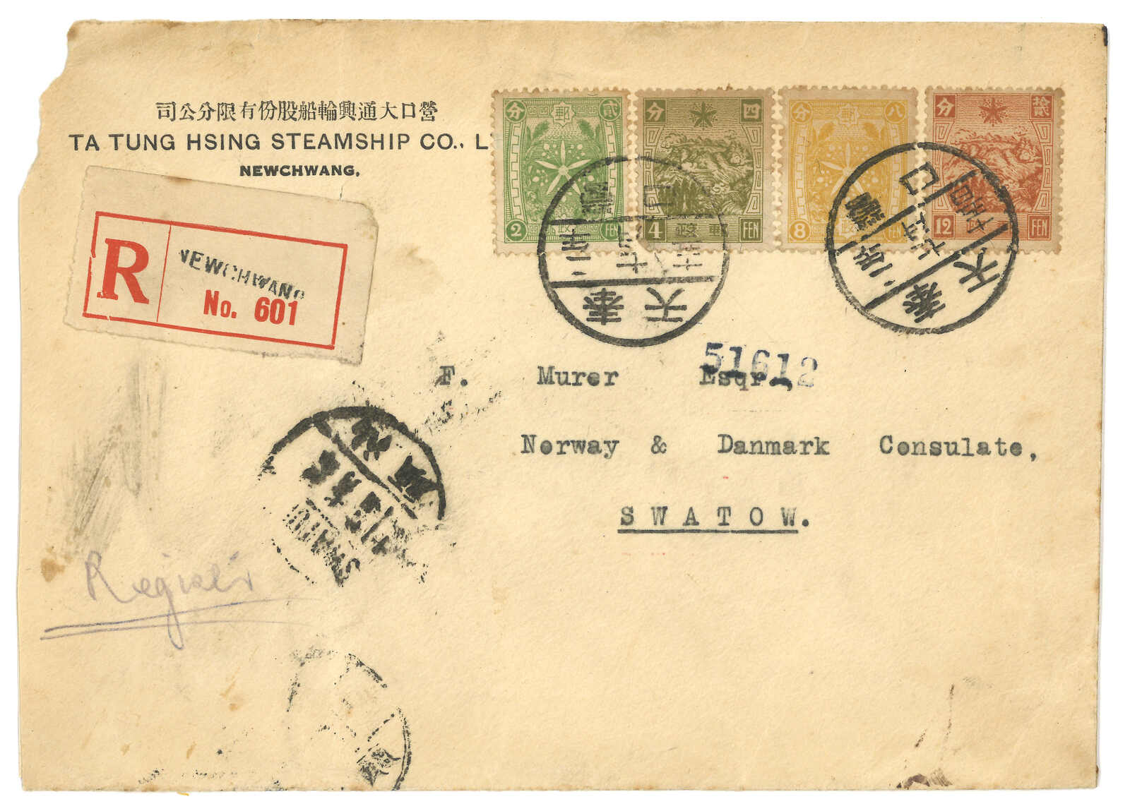 1600 cover image1935 Newchwang (15 Jul) to Swatow. Ta Tung Hsing Steamship c registered cover, f.w. China Mail issue 2f + 4f + 8f + 12f, tied by Moukden Newchwang cds. Arrived Swatow (Jul).