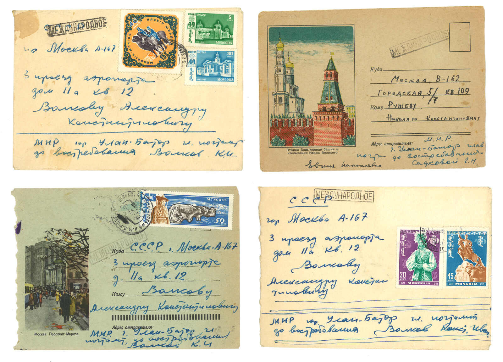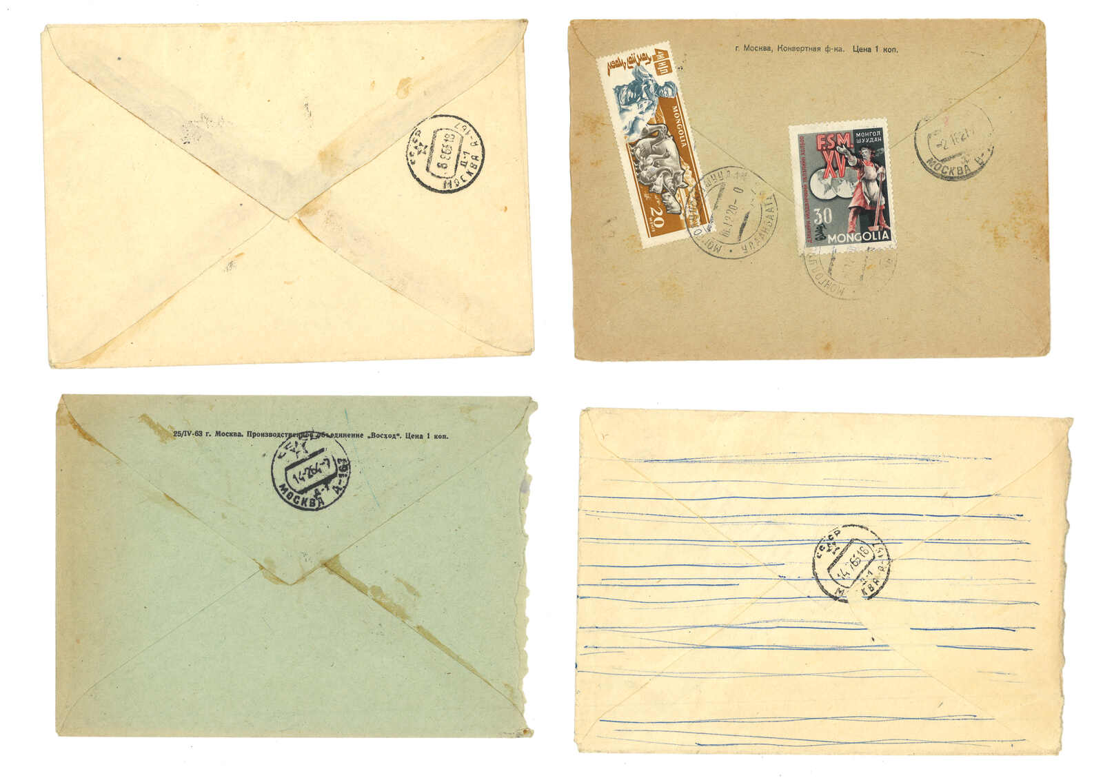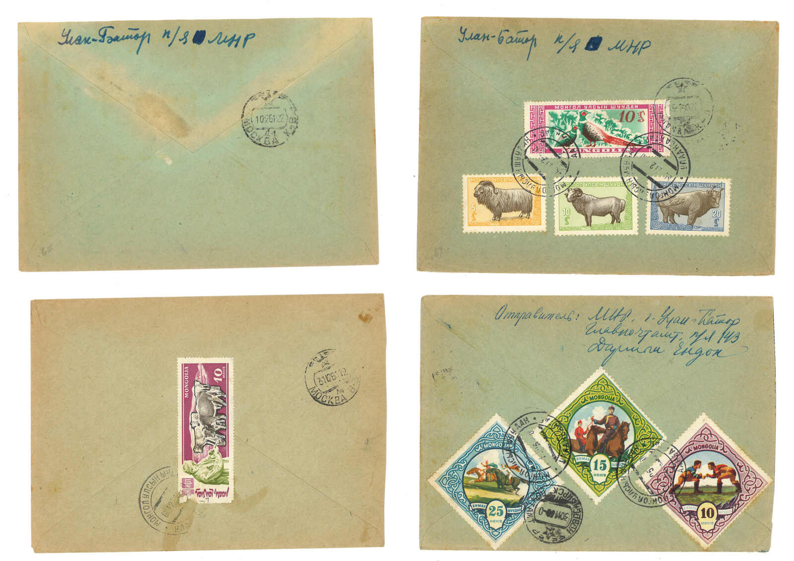 1960年代一組七件蒙古寄蘇聯封,貼有多套紀念票,包括人民共和國四十週年 - 畜牧、文化生活等。當中包括一件美術封。(Image 1) (Image 2) (Image 3) (Image 4)