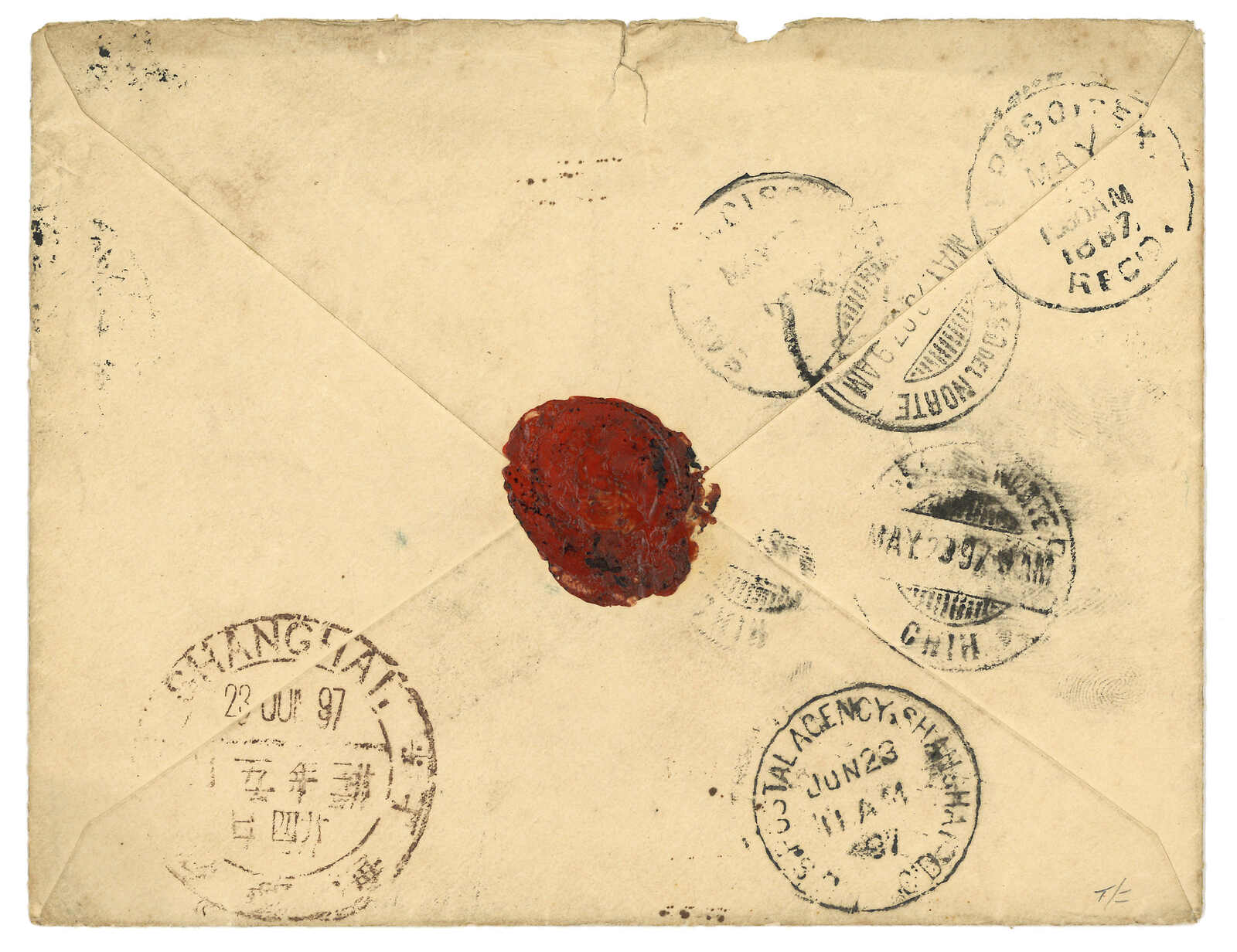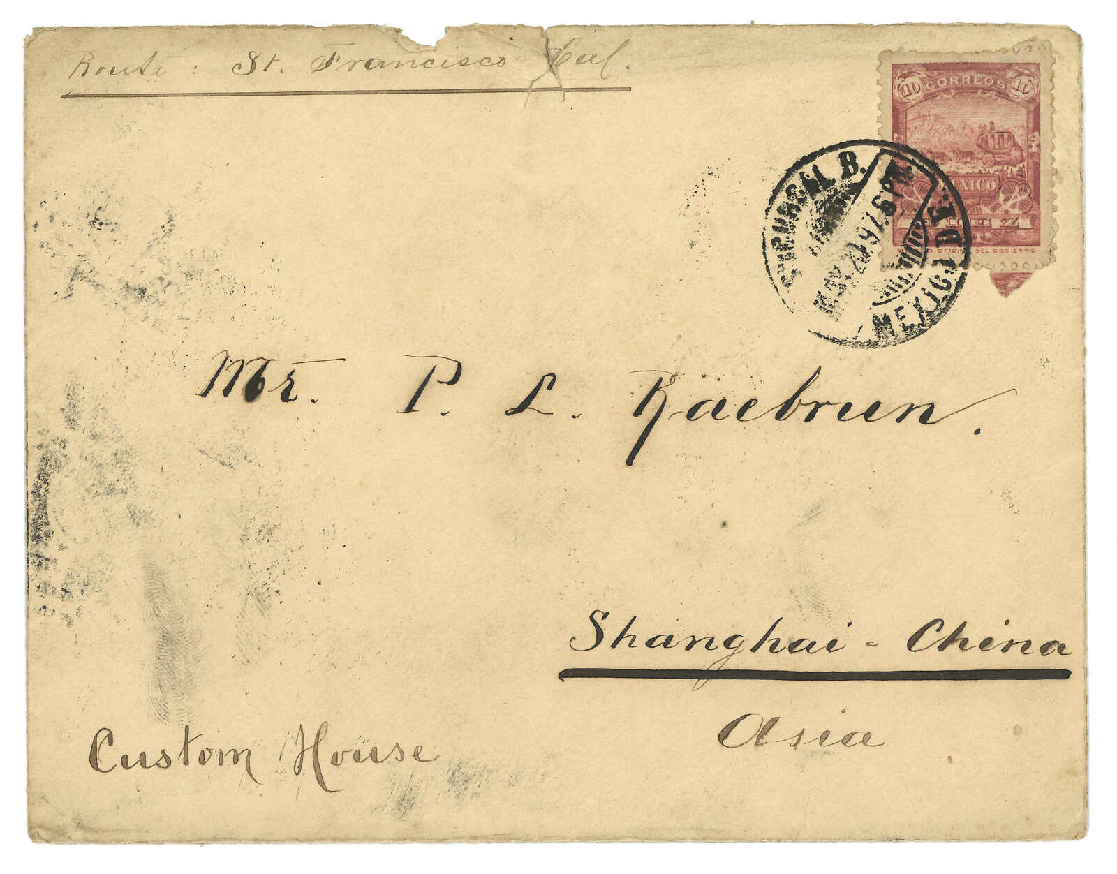 122 cover image1897. Mexico (20 May) to Shanghai Customs, f.w. Mexican 10c. Transit Texas (May), San Francisco (May), USPA Shanghai (23 Jun). Arrived Shanghai Chinese PO (23 Jun) with dollar cds. Very scarce origin.