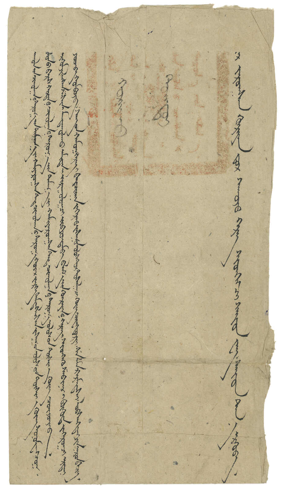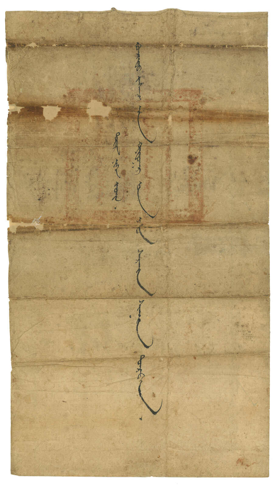 咸豐十三年(1863)大型公文封,自賽音諾顏汗寄喀爾喀後路,以蒙文書寫,鈐紅色官印。(Image 1)