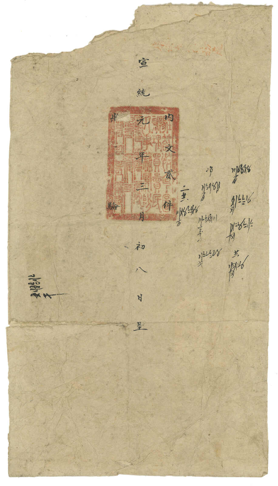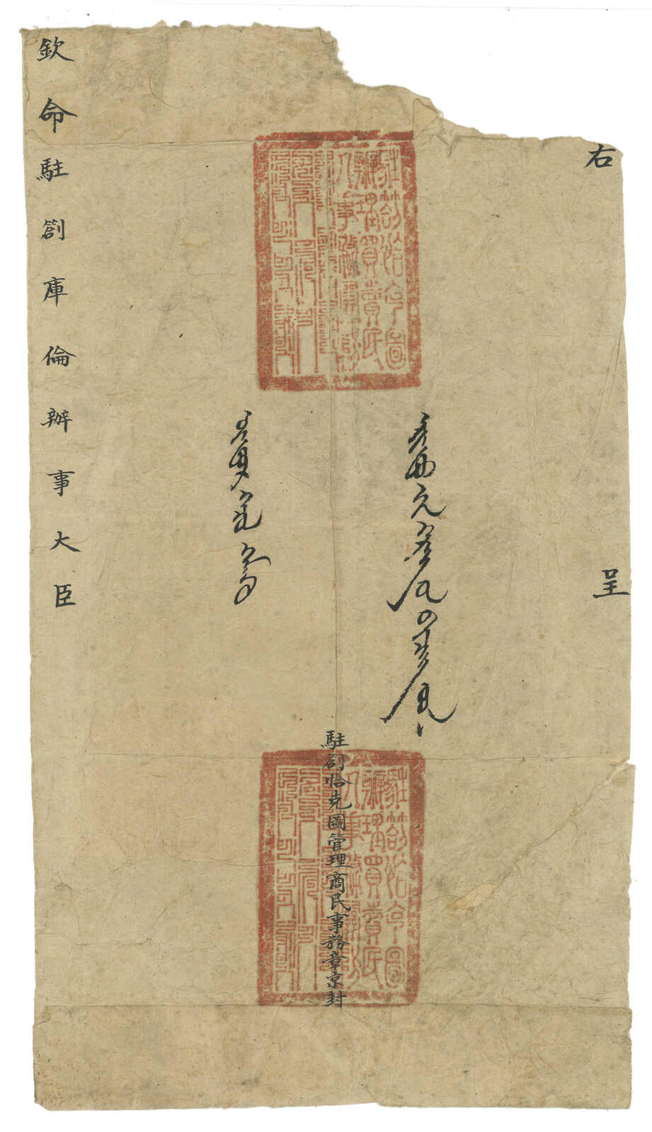 宣統元年(1909)大型公文封,由恰克圖辦理買賣寄庫倫大臣,鈐紅色官印。封右上角缺損。(Image 1)
