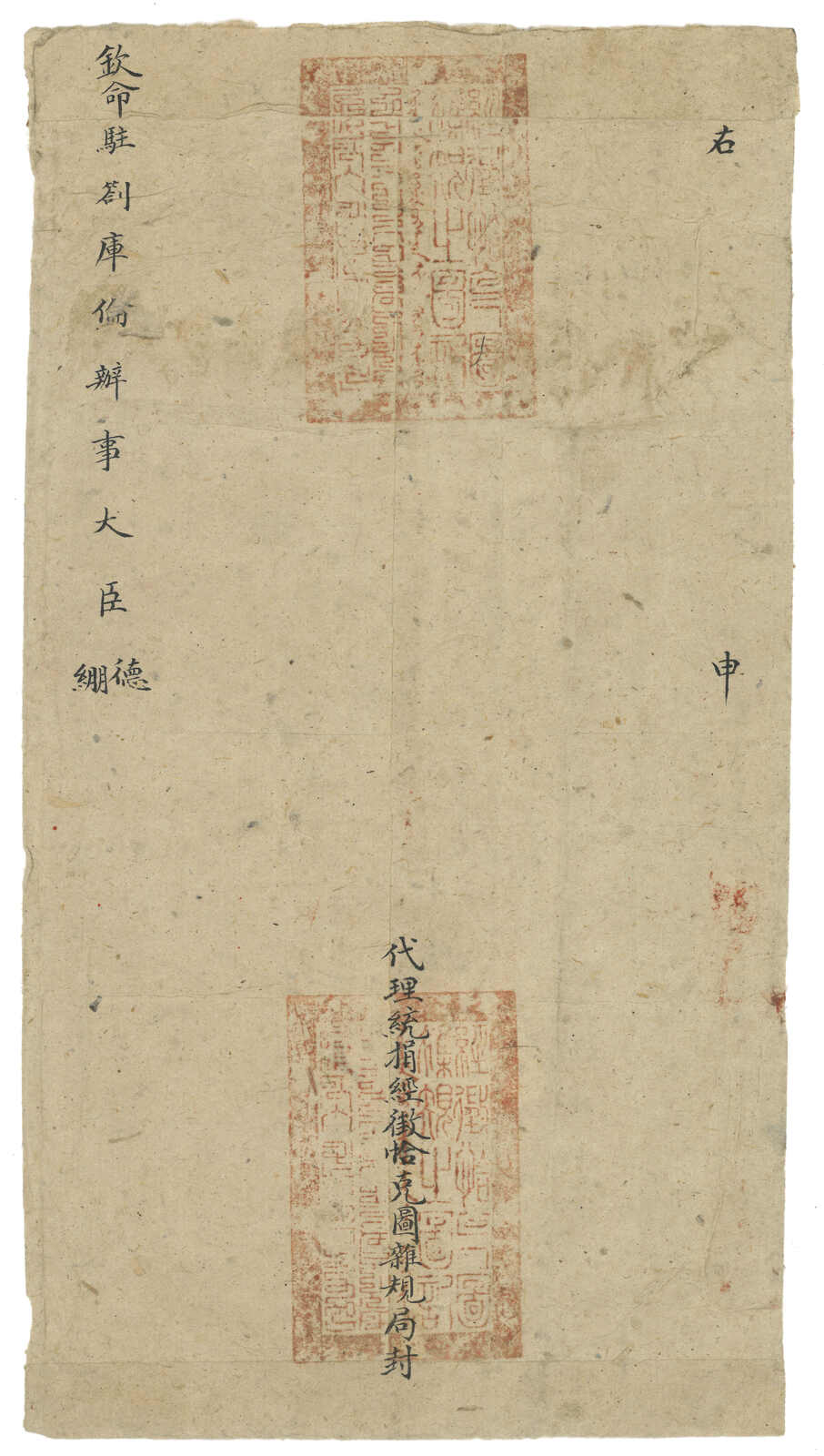 宣統二年(1910)大型公文封,鈐“駐箚苦倫辦理買賣民人事務關防”紅色官印,致車臣汗部。(Image 1)
