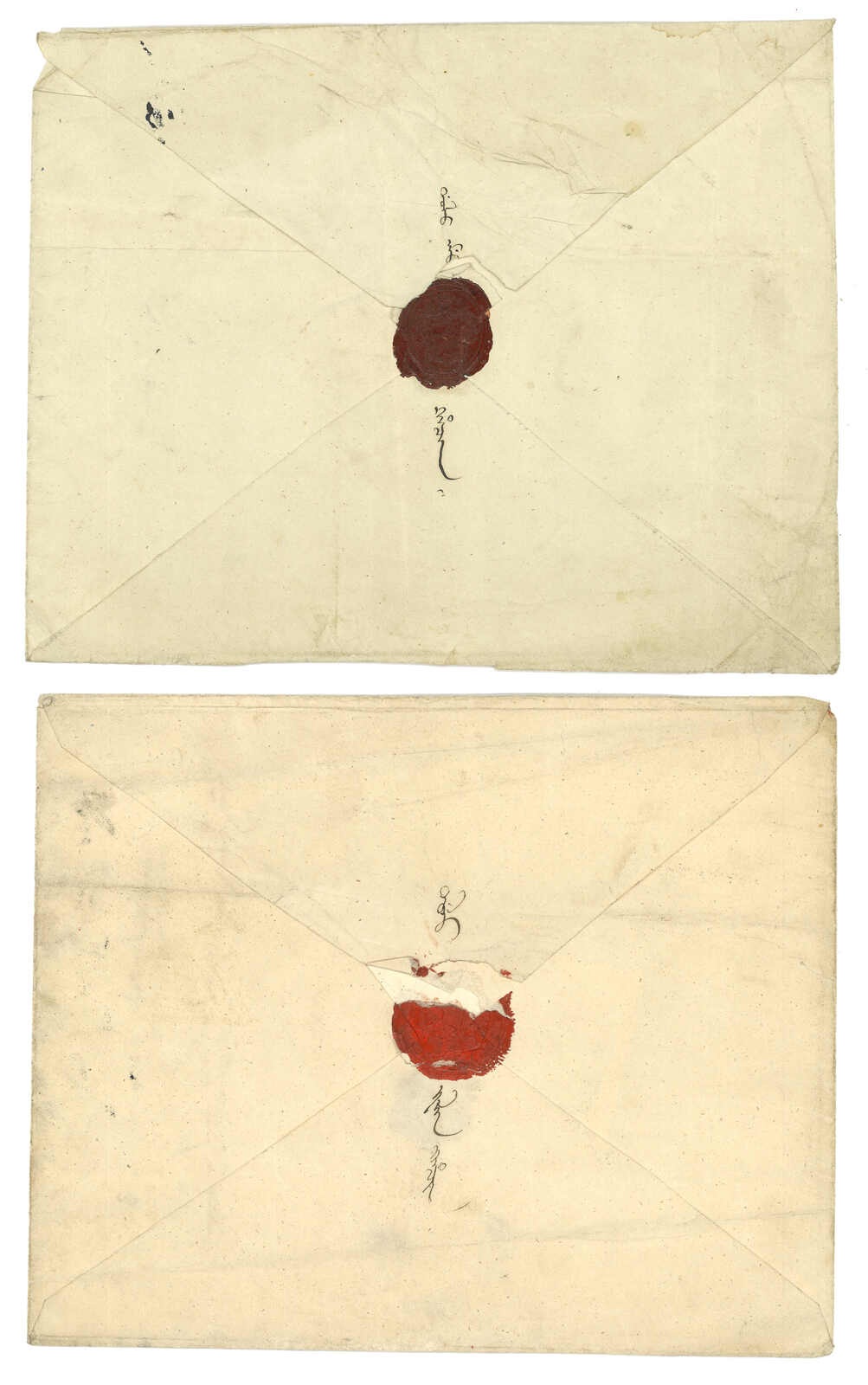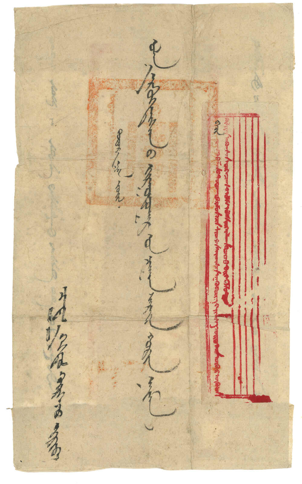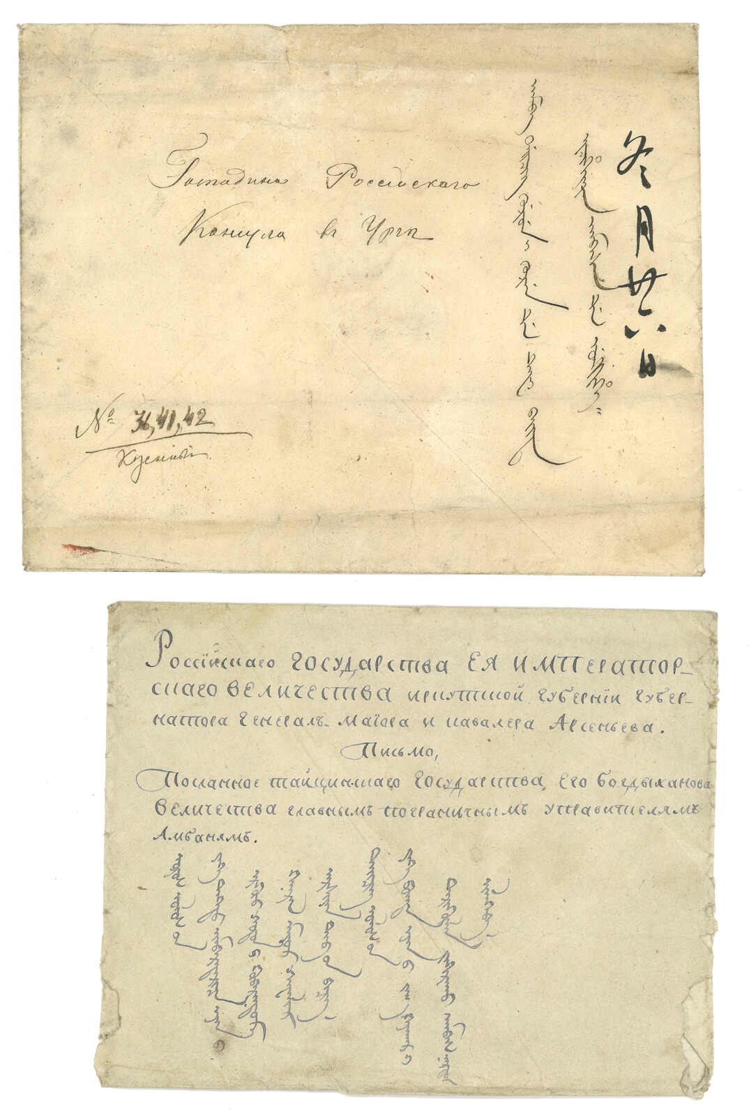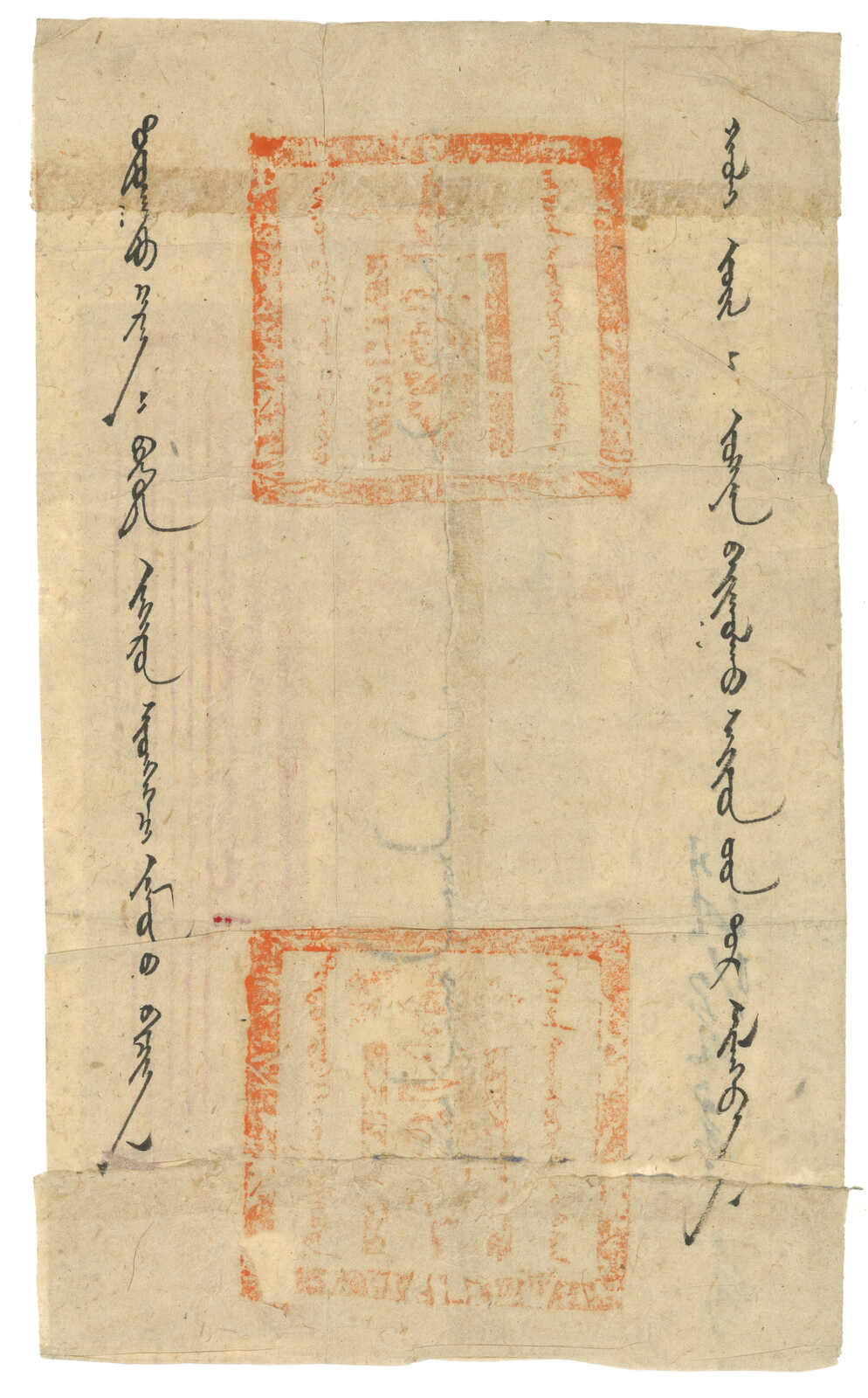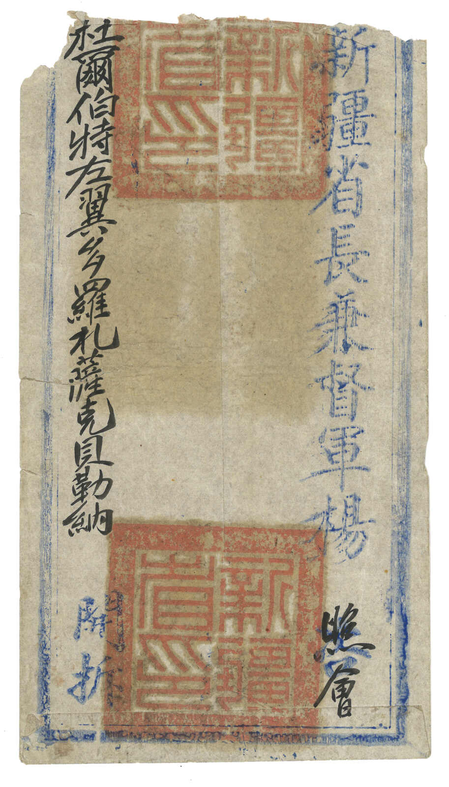 大型公文封,由杜爾伯特左翼多羅札薩克貝勒寄新疆省長楊增新,鈐官印。自1918年阿勒泰劃歸新疆,楊增新時常與科布多地區各部落領袖通信以爭取人心。此封應是經新疆境內之中國信差送至古城子,再經蒙古之驛站送遞。封頂打開。(Image 1)
