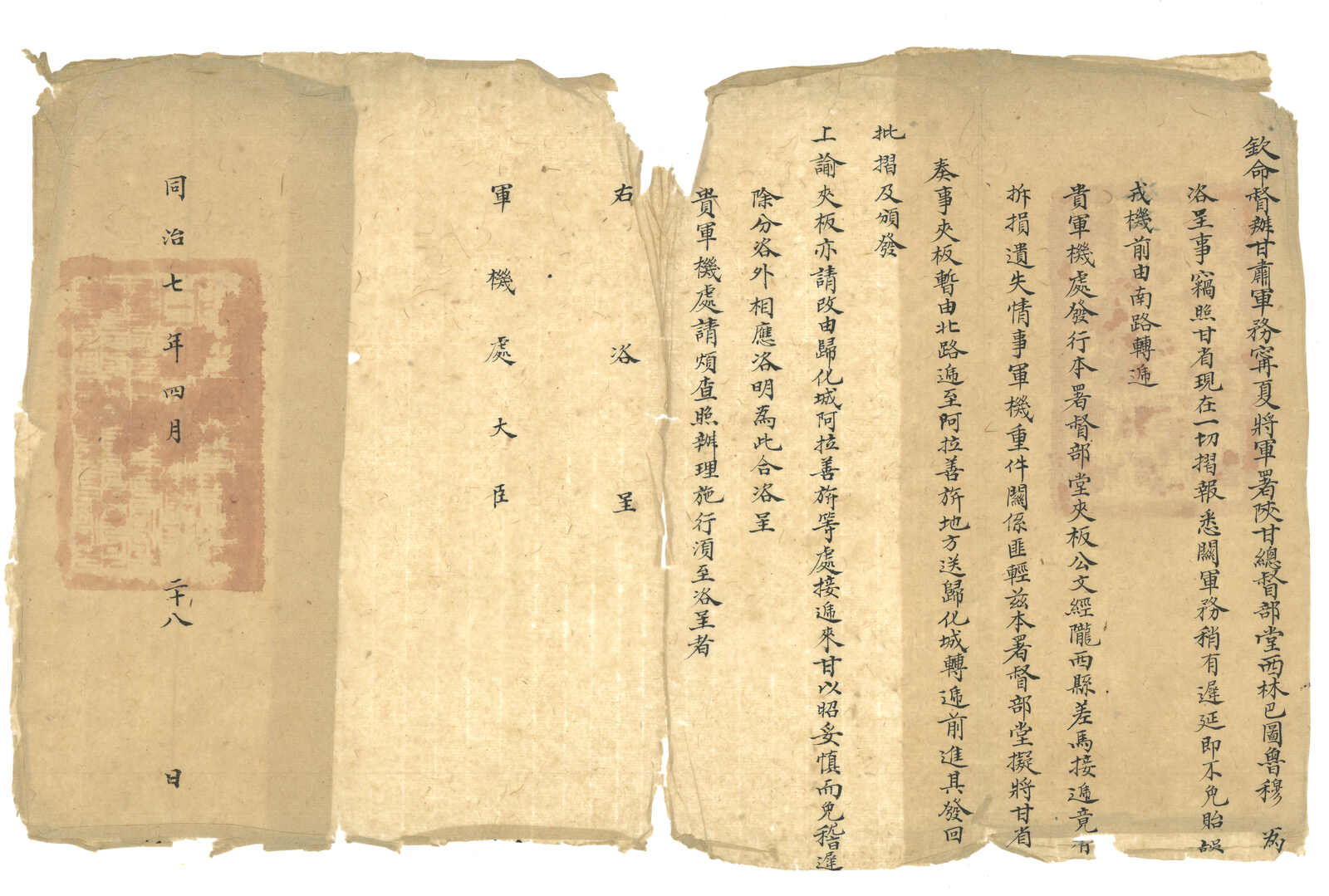 同治七年(1868)督辦甘肅軍務寧夏將軍署陝甘總督信紙一份,內容為要求軍機處將驛遞郵路由經隴西縣改至由北路遞至阿拉善旗,以避免丟失。(Image 1)