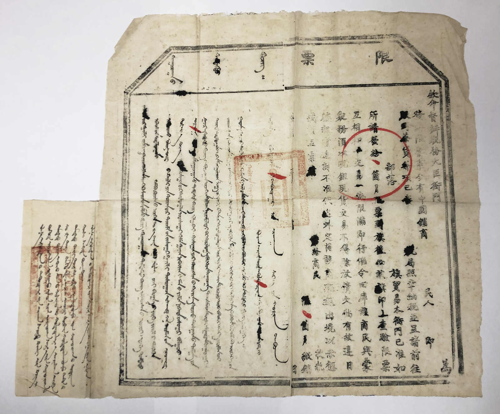 1915 a trade license written in Chinese and Mongolian, issused to Chinese merchants in Mongolia so that they could trade in designated area.