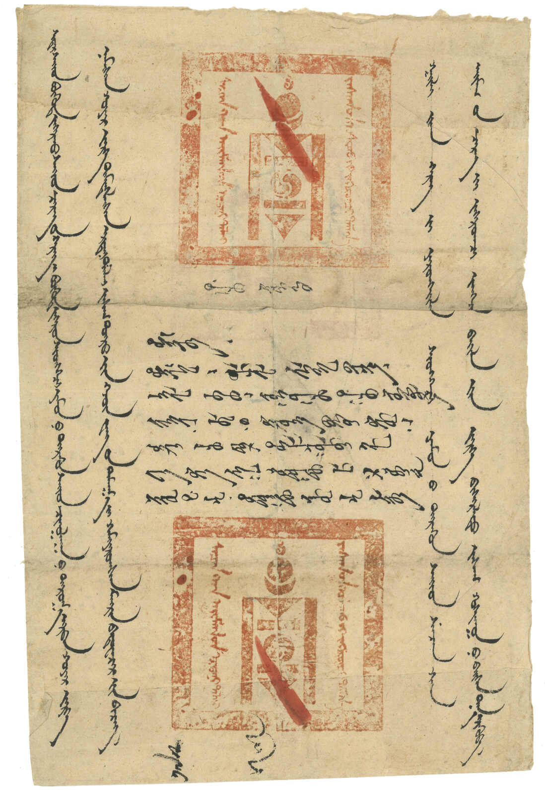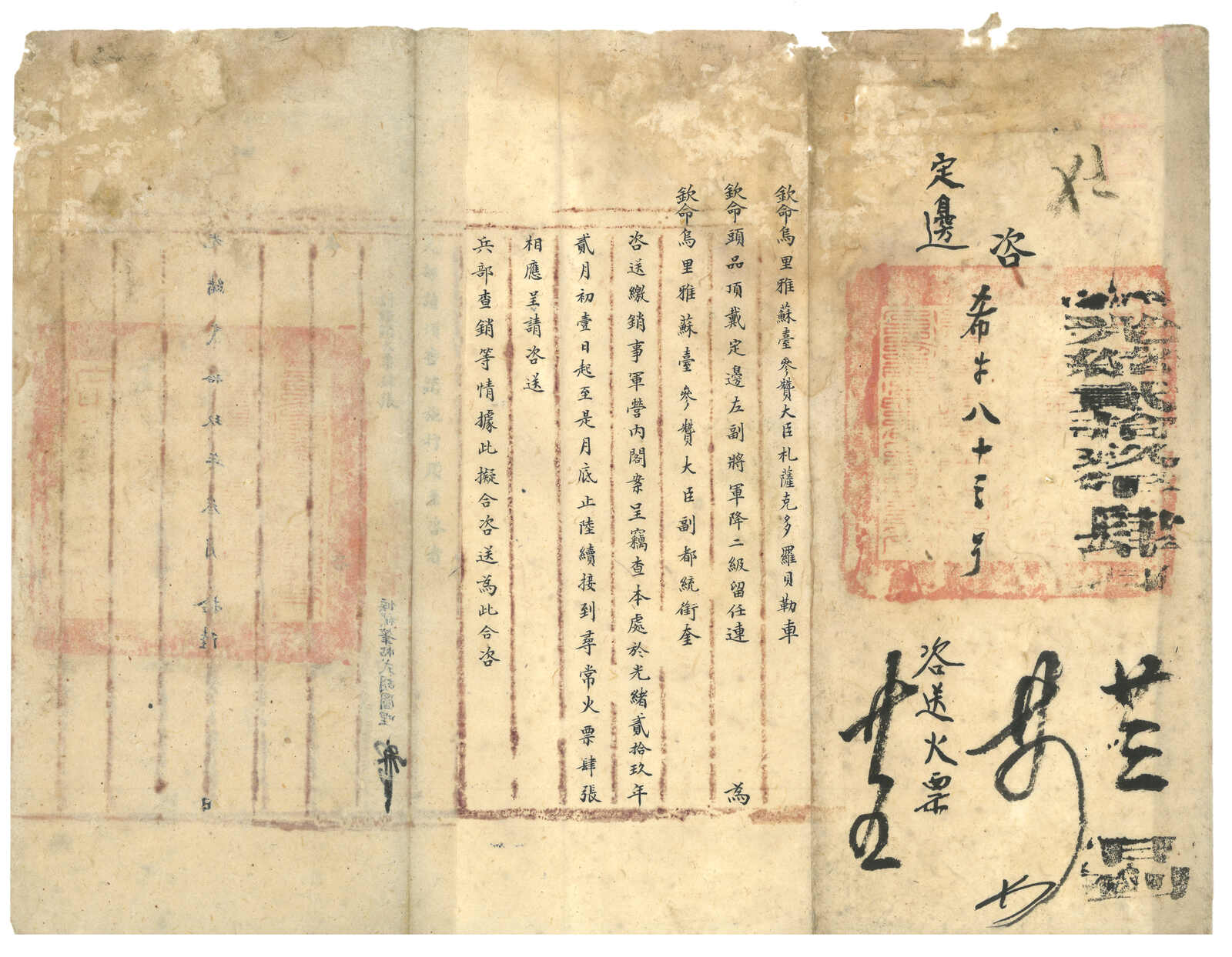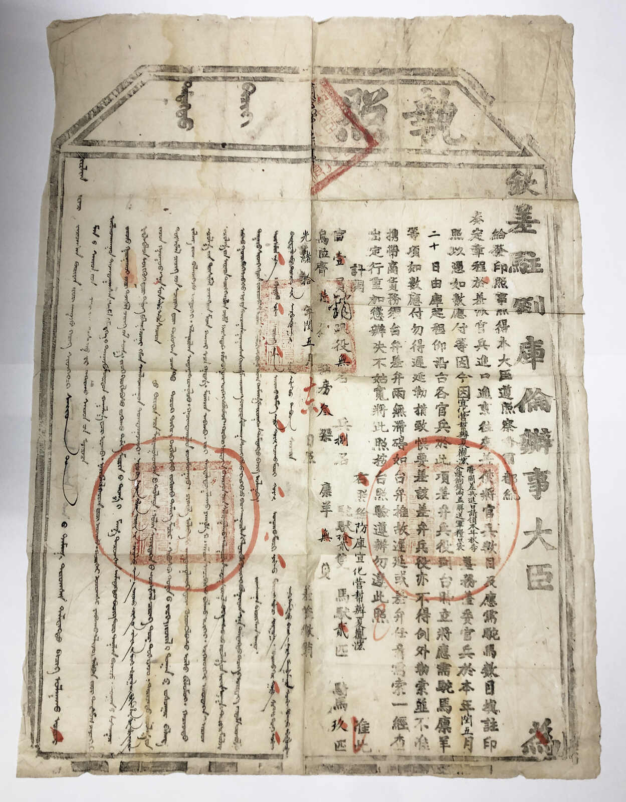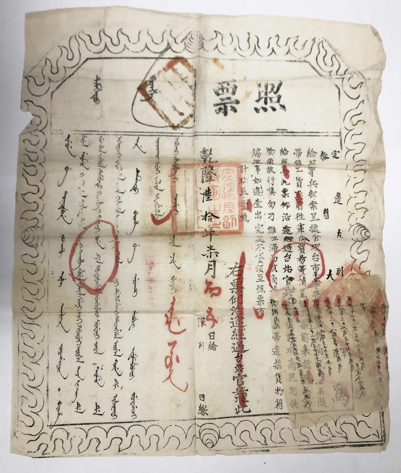 乾隆六十年(1795)照票一份,由烏里雅蘇台將軍頒發給前往庫倫經商之商人,鈐“定邊左副將軍”官印。持有人可通獲驛站放行。(Image 1)