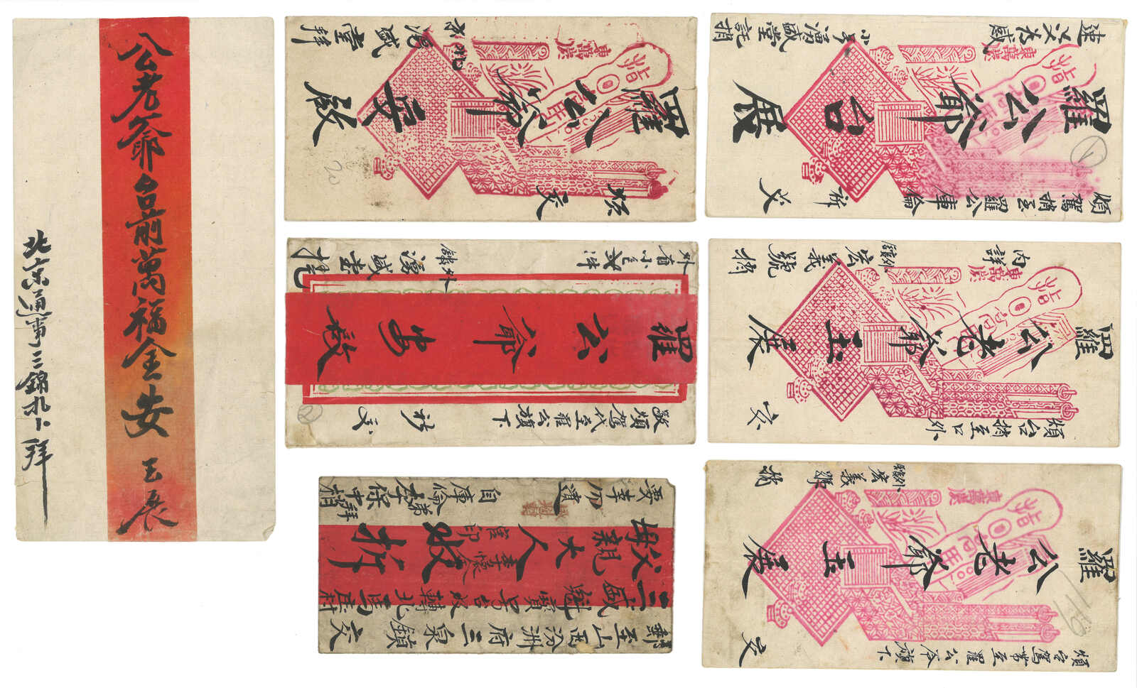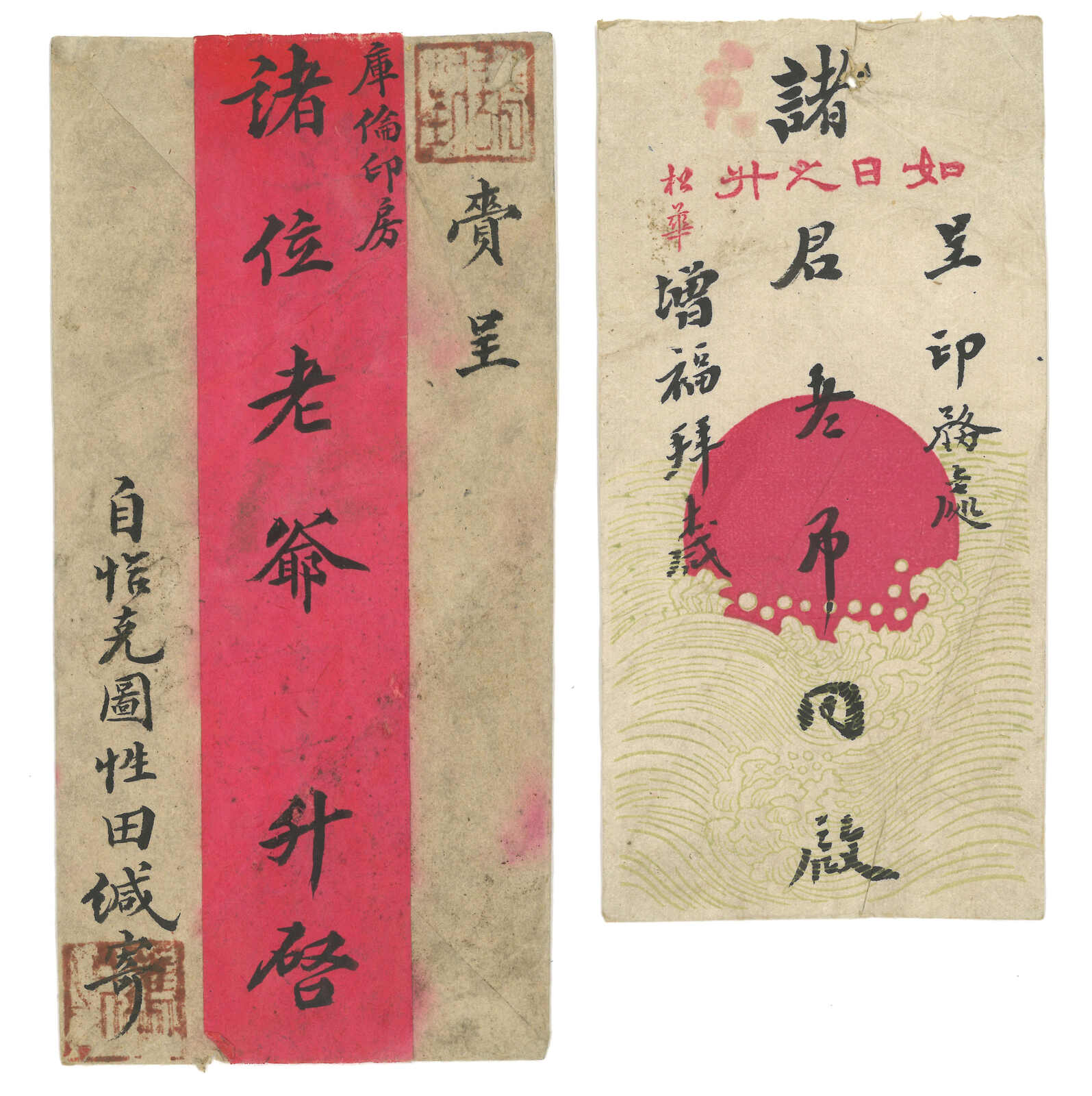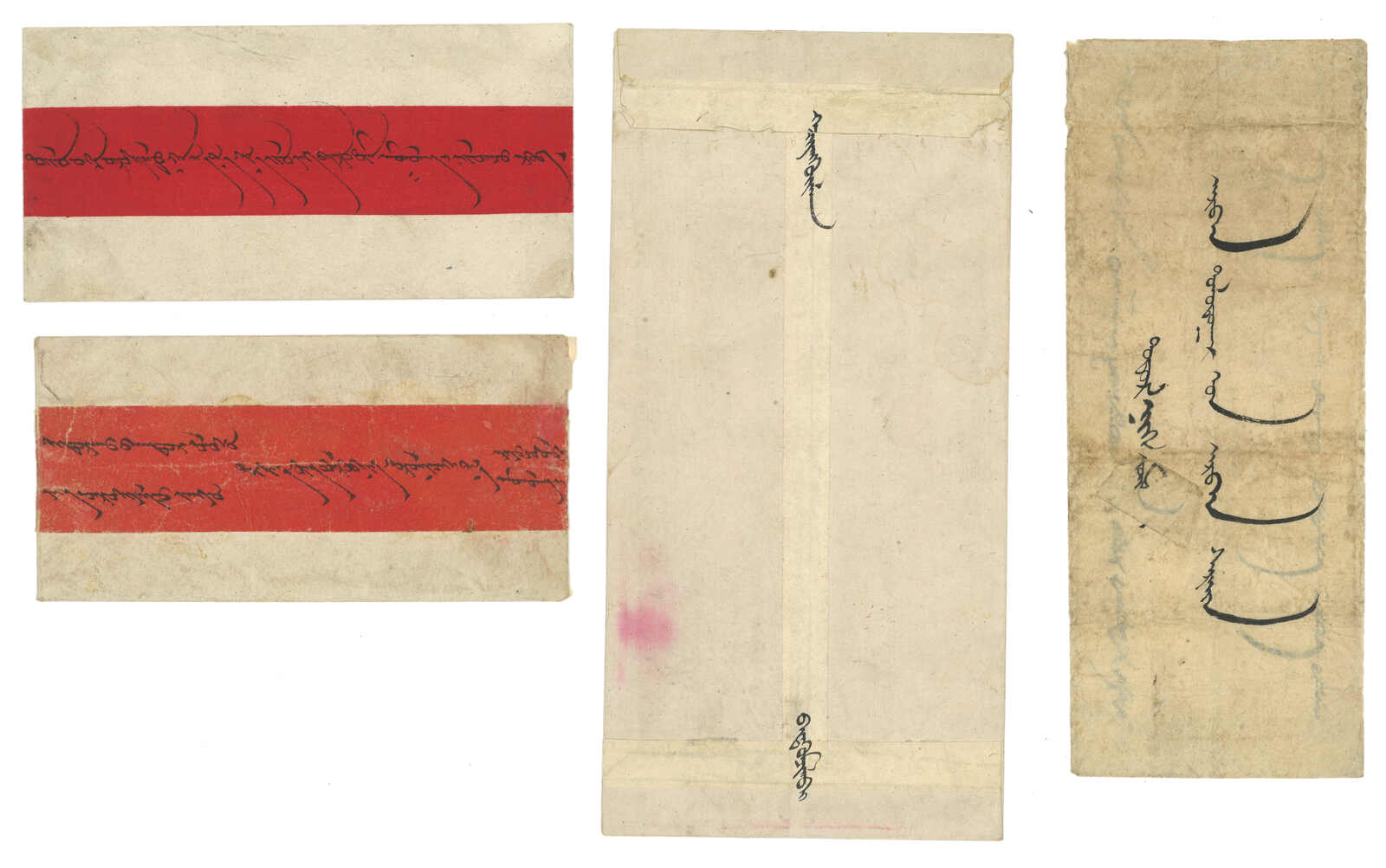 ca 1920s a group of 3 frankless red band covers used in Mongolia. With exhibit page for introduction.