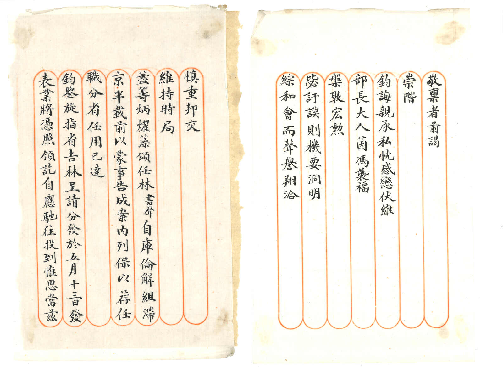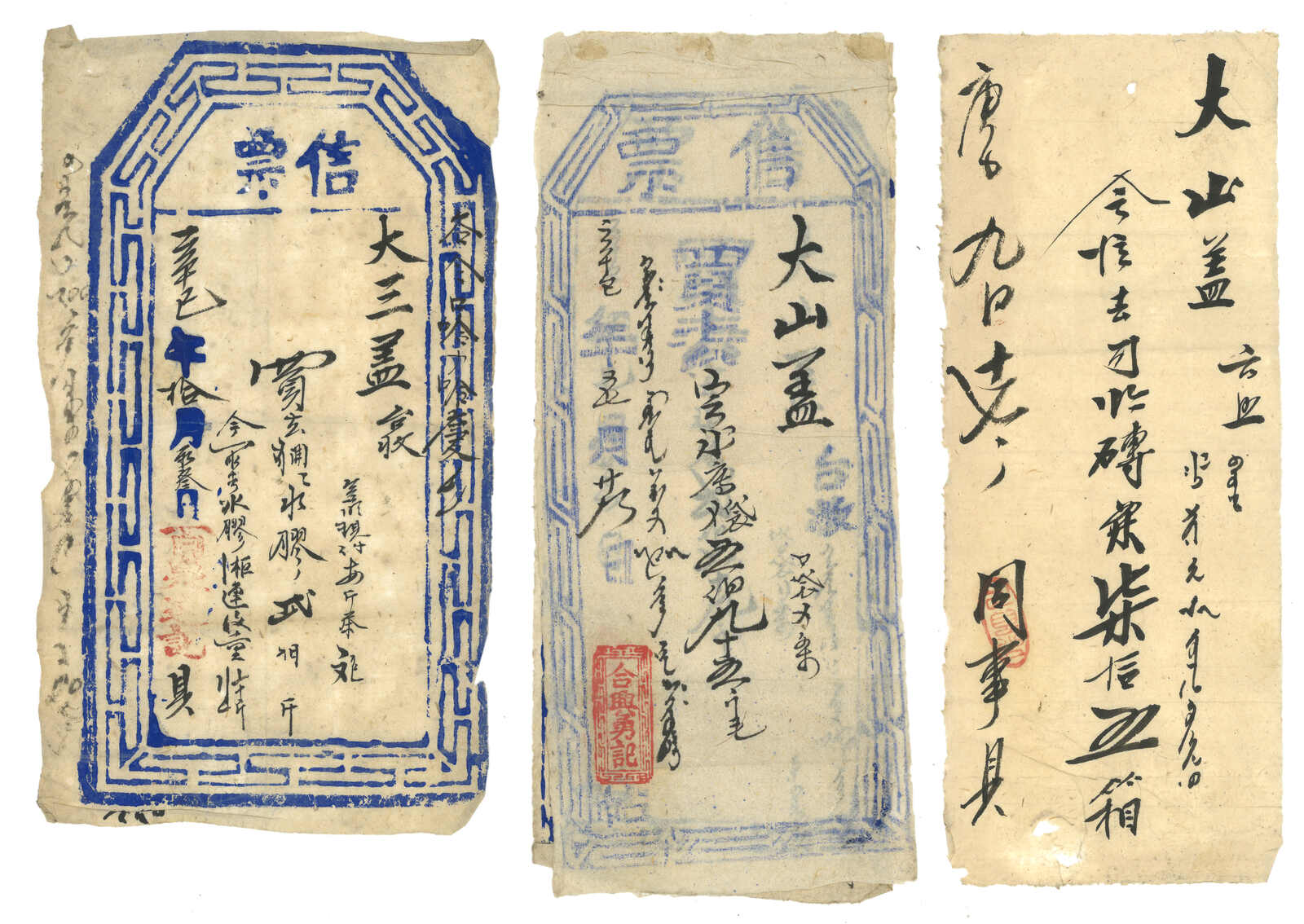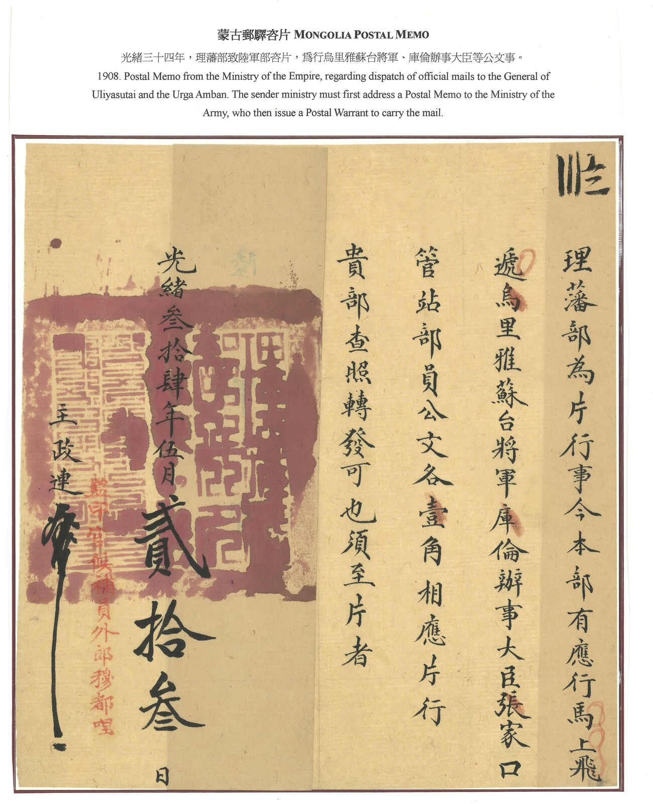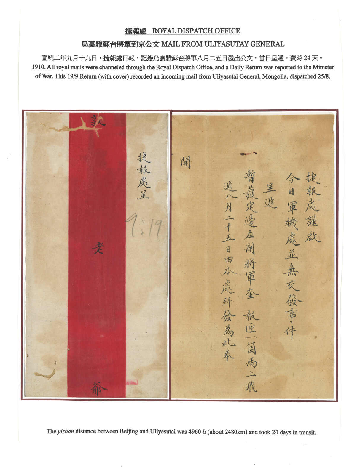 1900年代一組三件往來烏里雅蘇台將軍之驛站公文,包括捷報處紅條封及郵驛咨片。(Image 1)