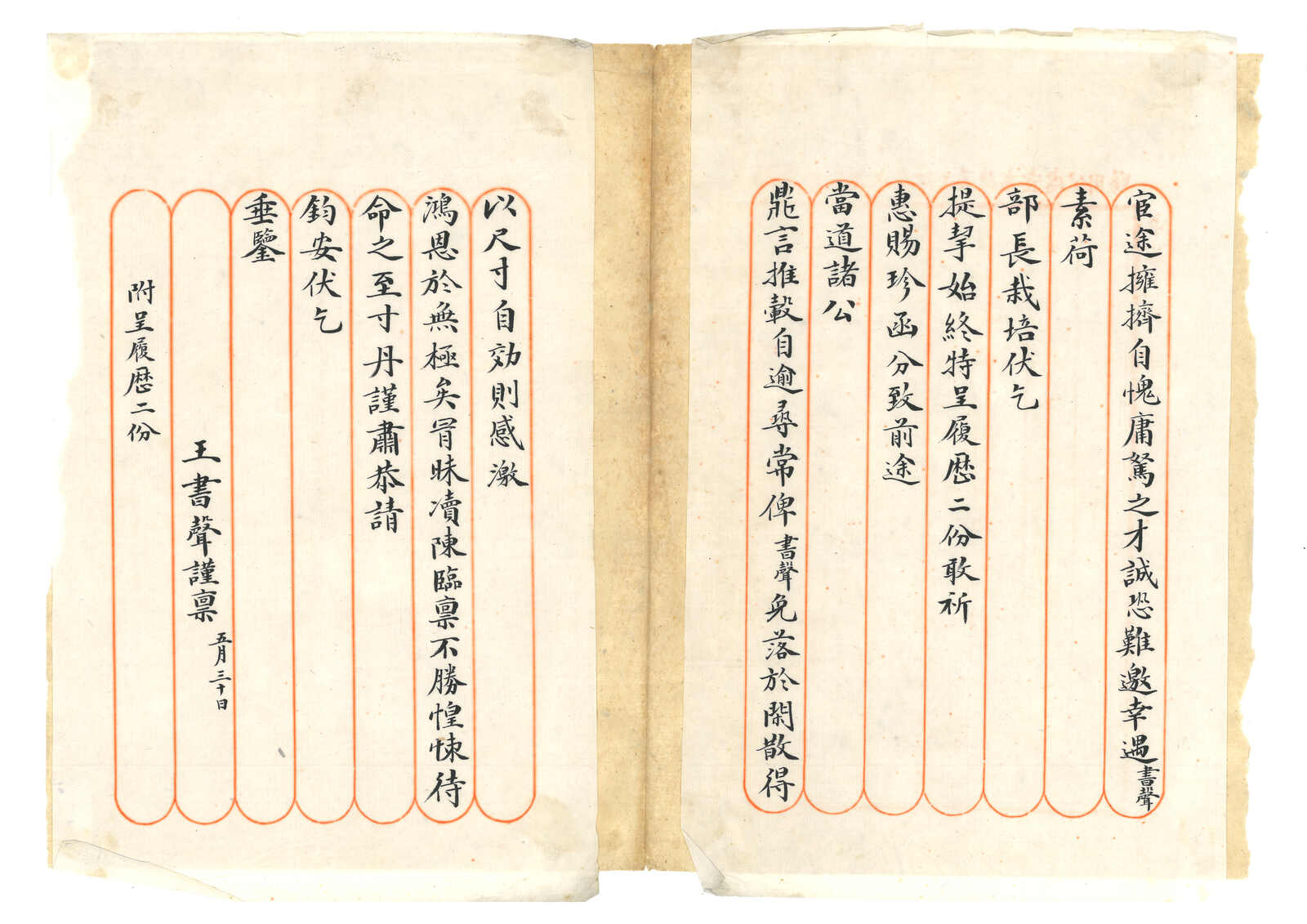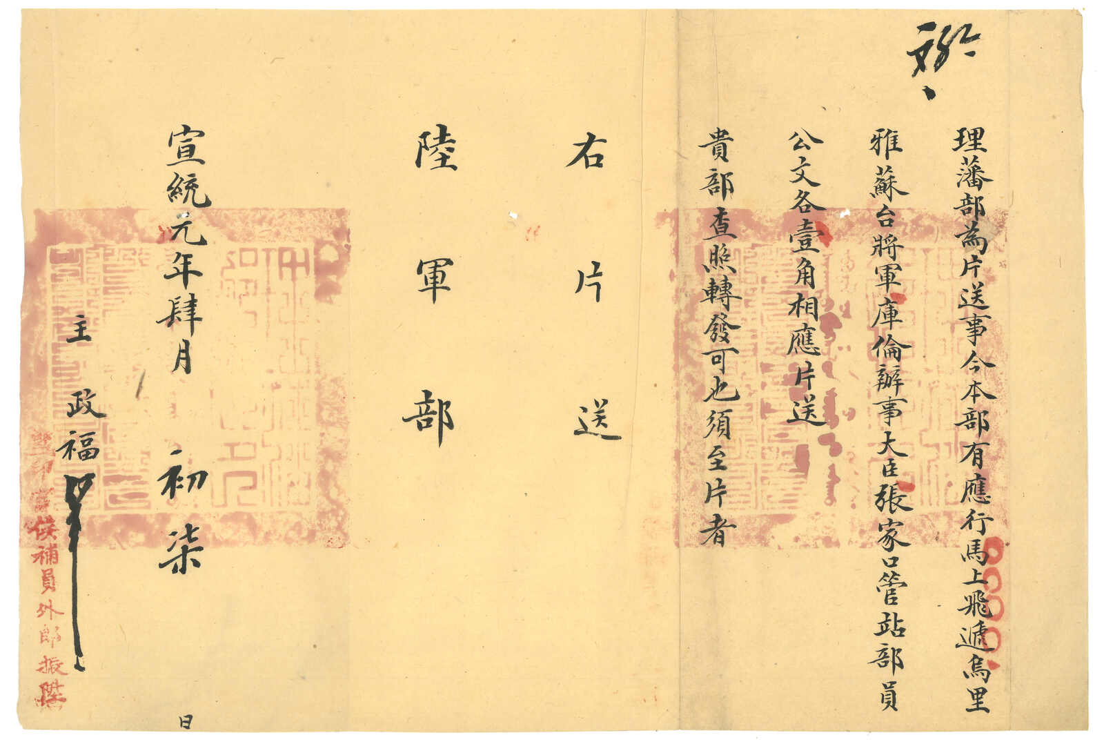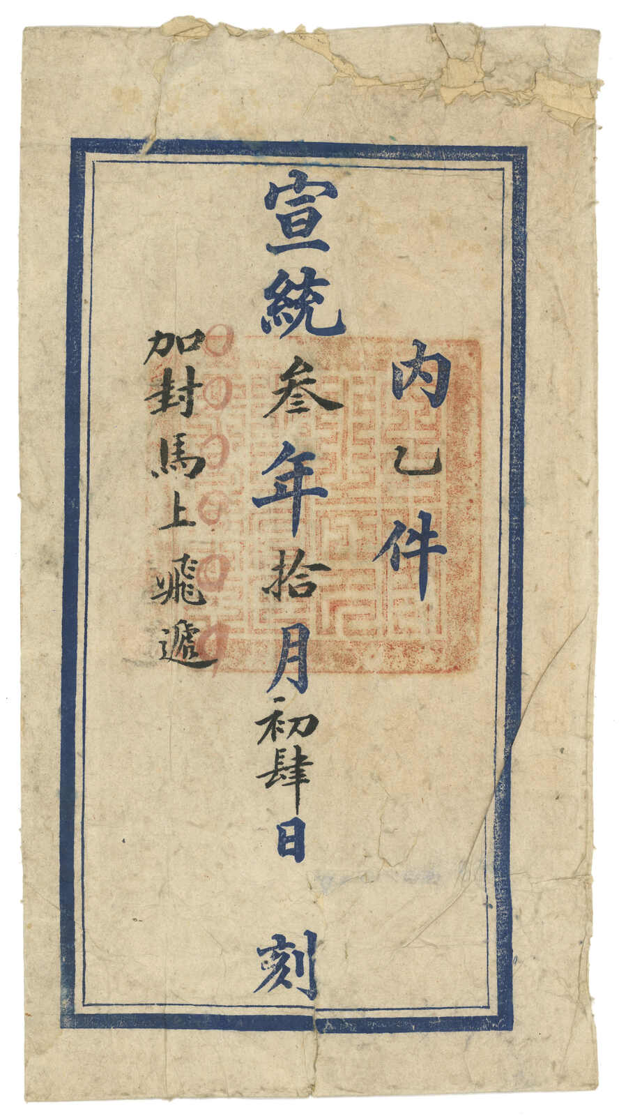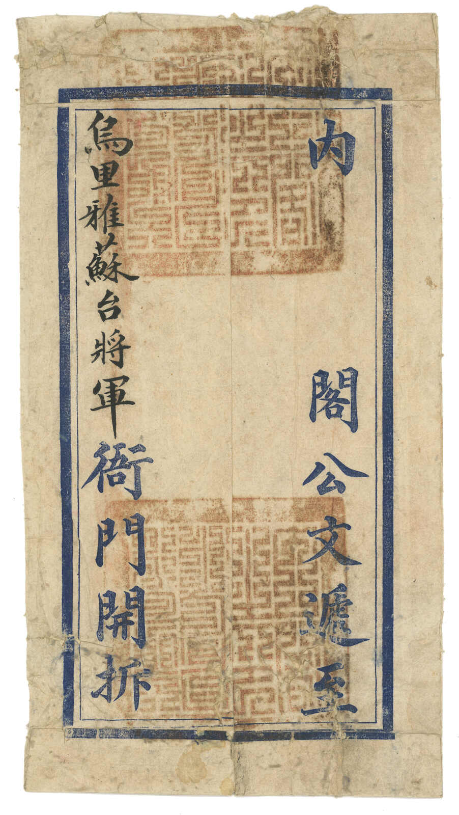 宣統年間兩件烏里雅蘇台將軍大型公文封及咨陸軍部片。前者日期為1911年11月,可能為清政府倒台前最晚之驛站公文。(Image 1)