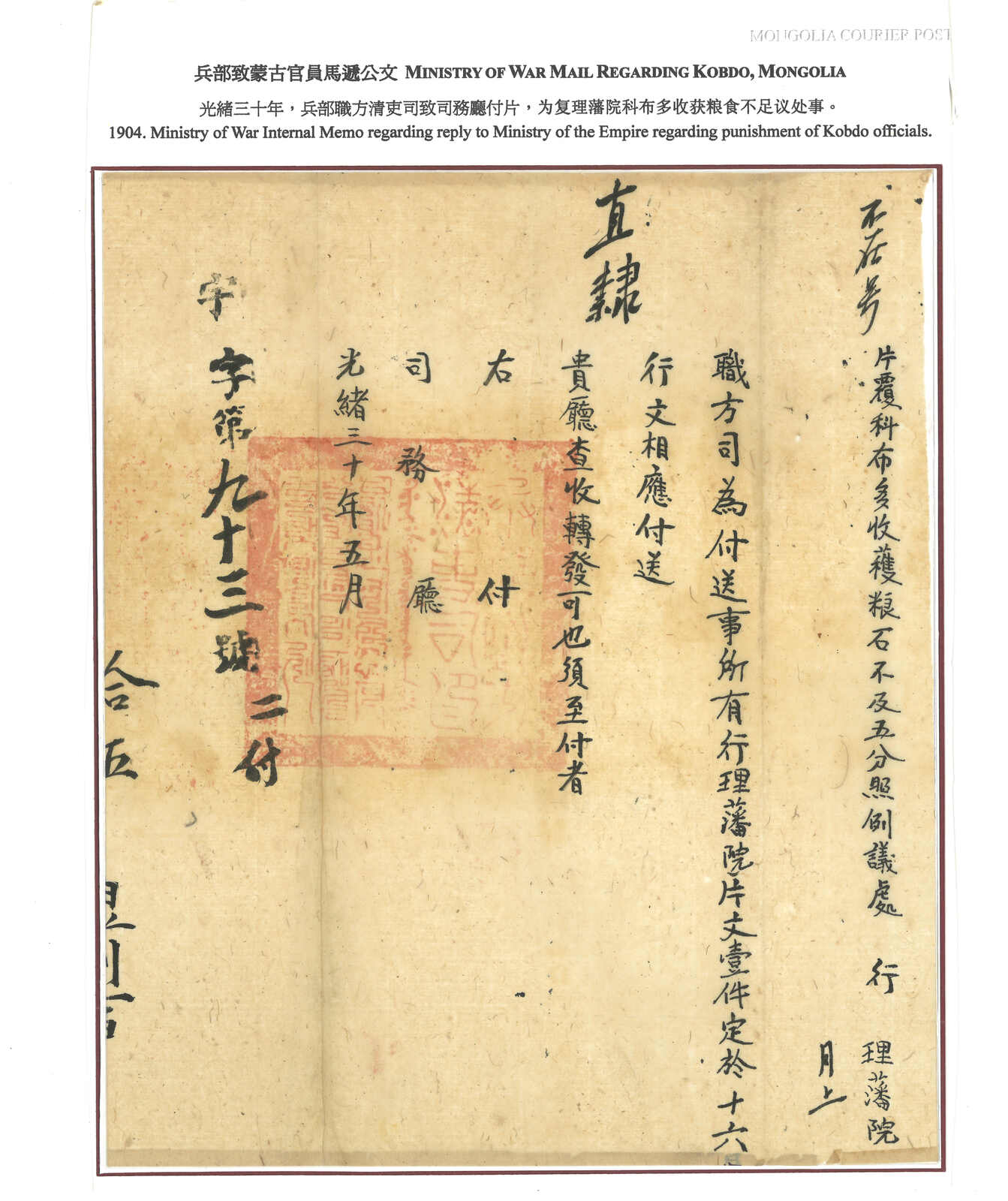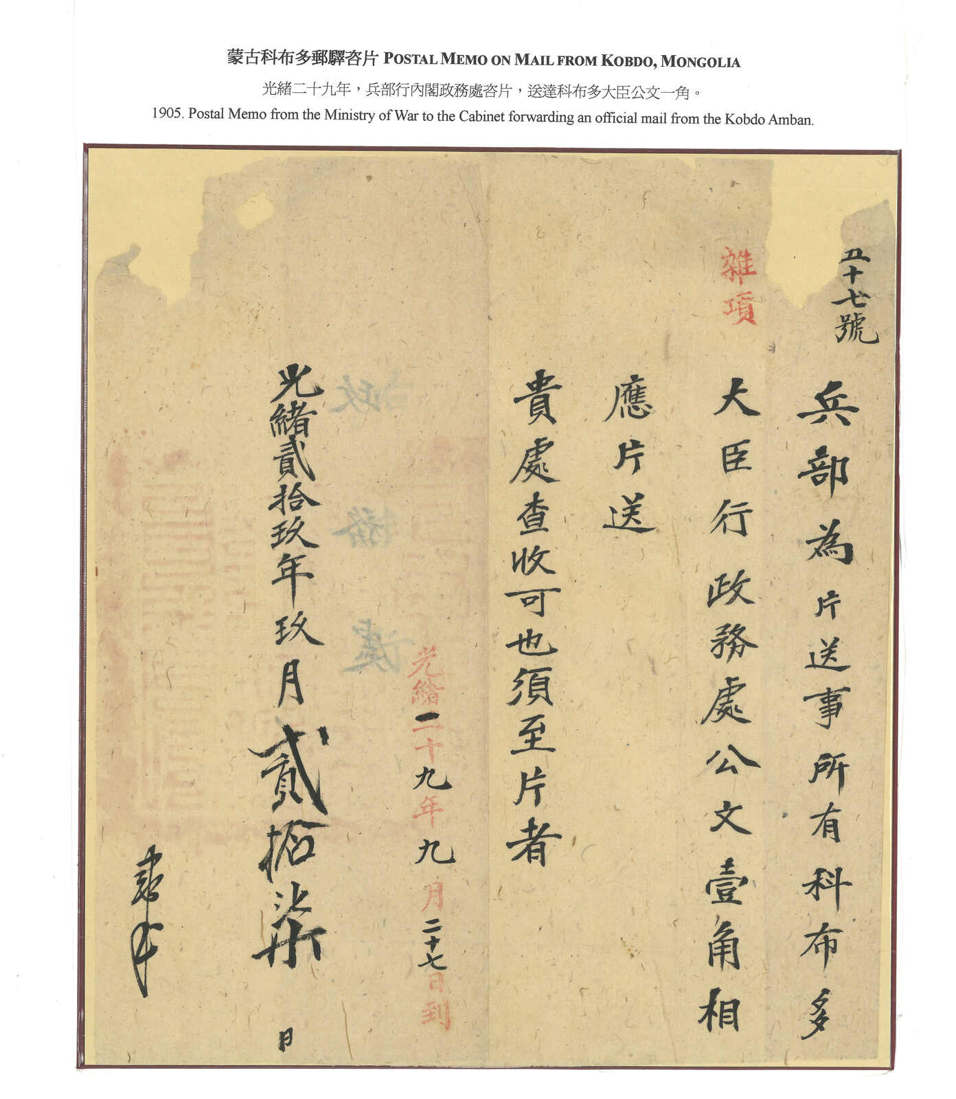 1900s a group of 3 postal memos and mails to/from General of Uliasutai. including red band cover of royal dispatch office.