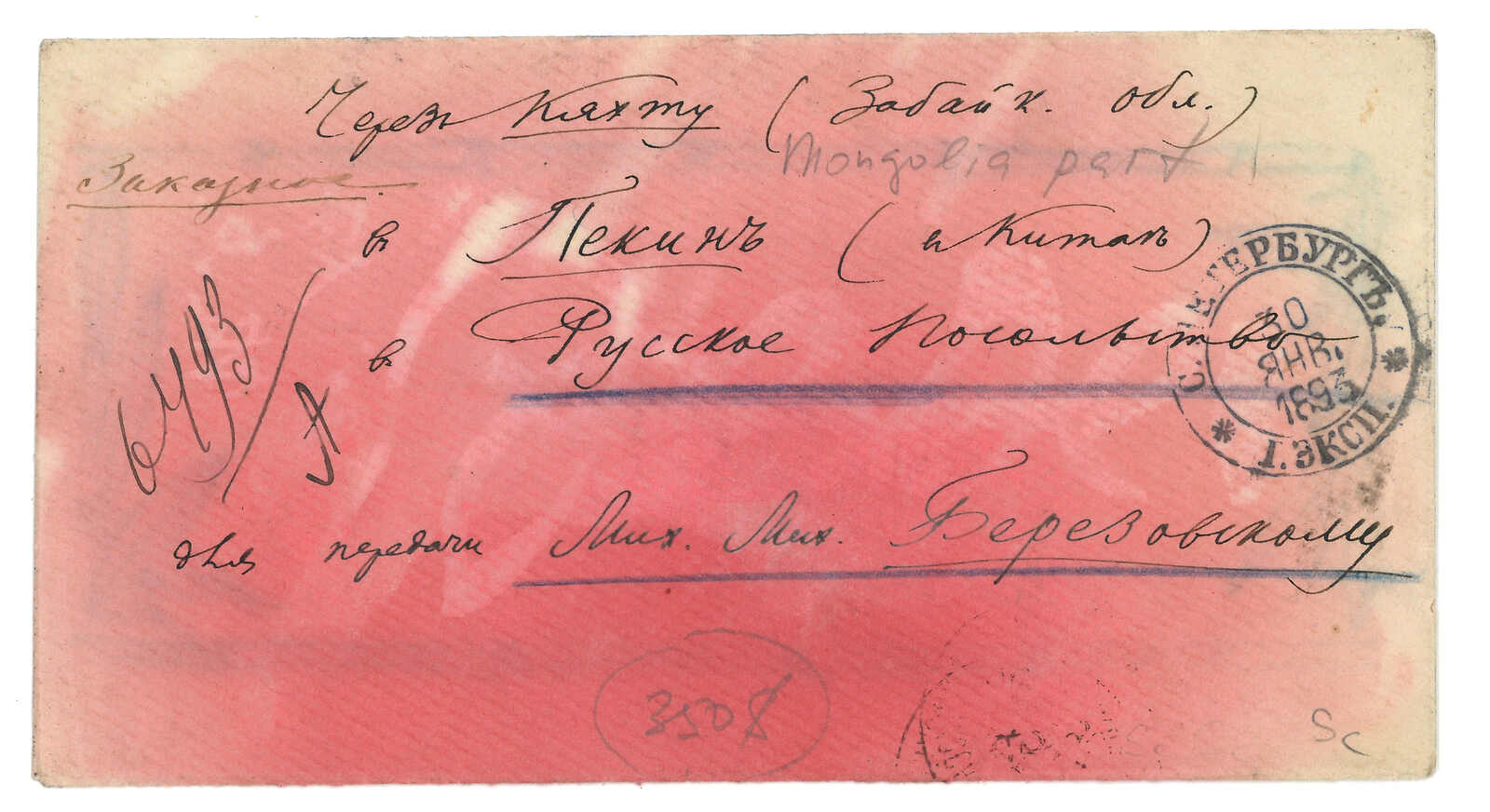 1893 St. Petersburg (30 Jan) to Peking, f.w. Coat of Arms 7k in pair on reverse, tied by St. Petersburg cds. Transit Troitskosavsky (3 Mar) with Hellrigl type 1c cds.
