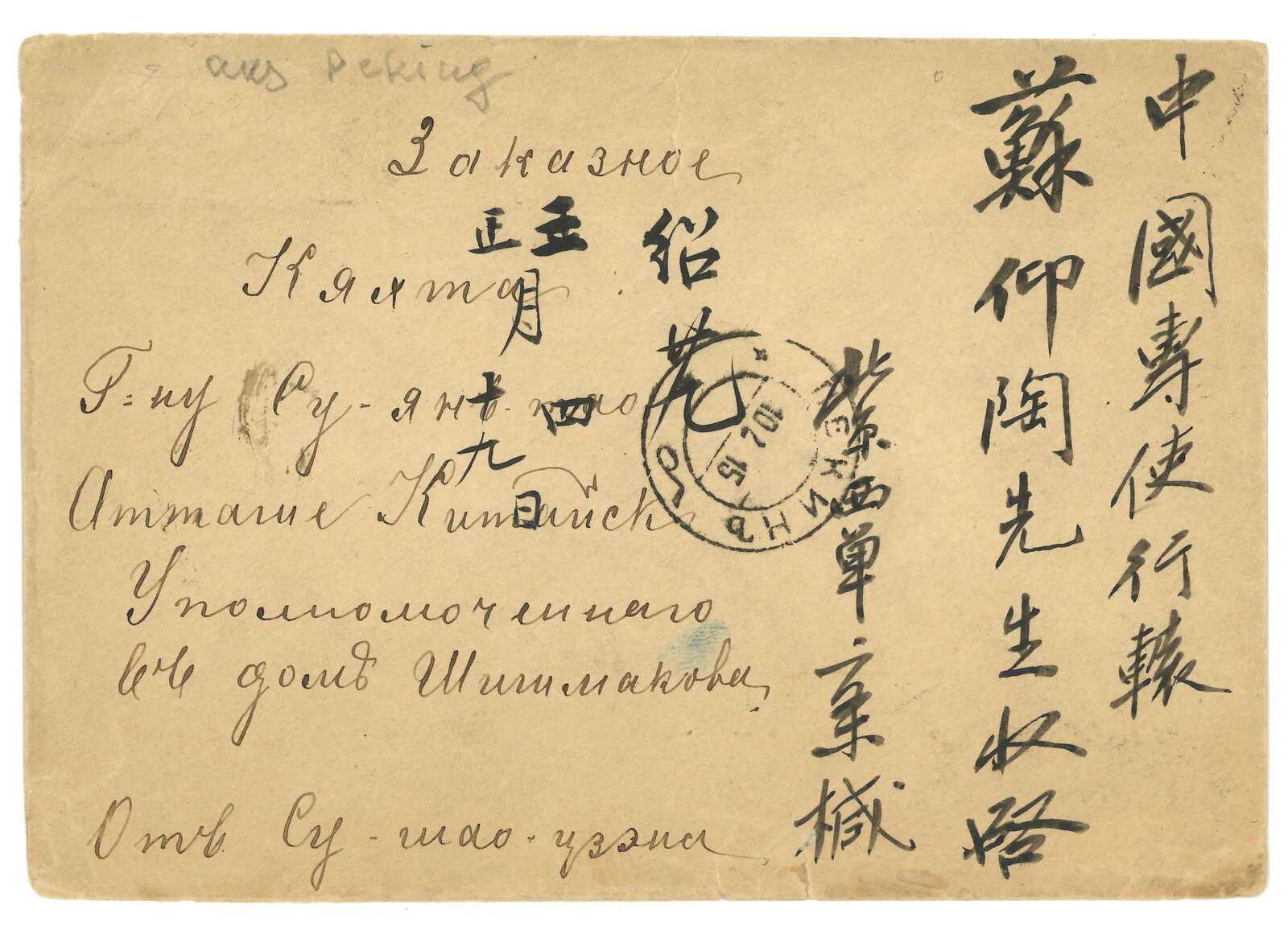 1915.2.10 北京寄恰克圖,收件人為中國專使蘇仰陶,背貼軍徽圖加蓋KITAI 20戈比,銷北京俄局日戳。2.19抵恰克圖俄局。經俄國在華客郵局送至俄國蒙古郵局之少見例子。(Image 1)