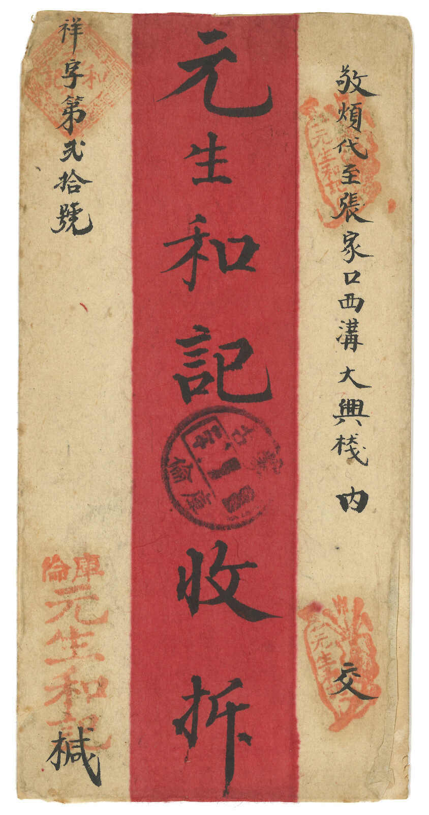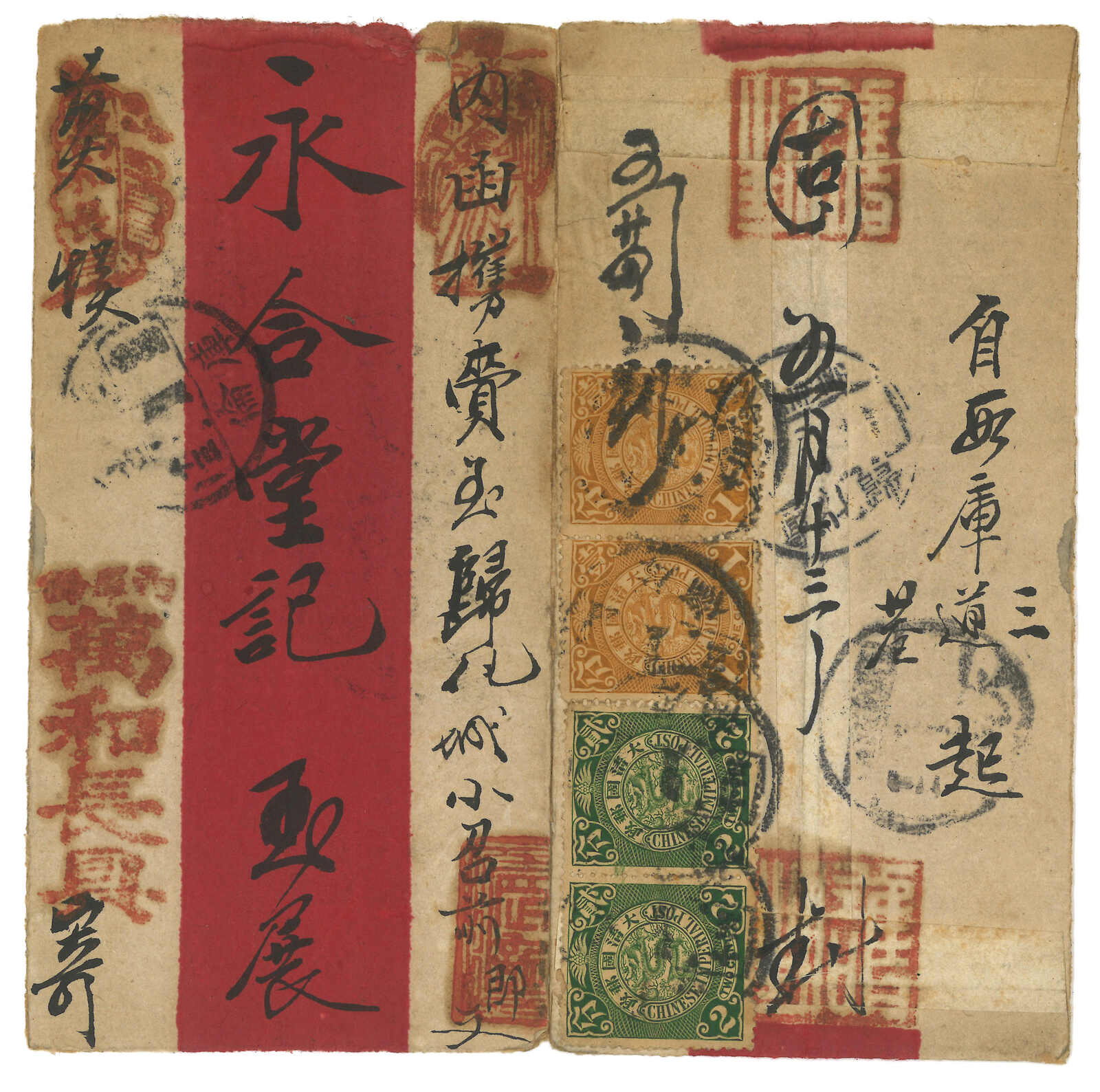 約1911年庫倫寄張家口。紅條封,背貼蟠龍2分直三連,銷蒙古庫倫腰框日戳。(Image 1)