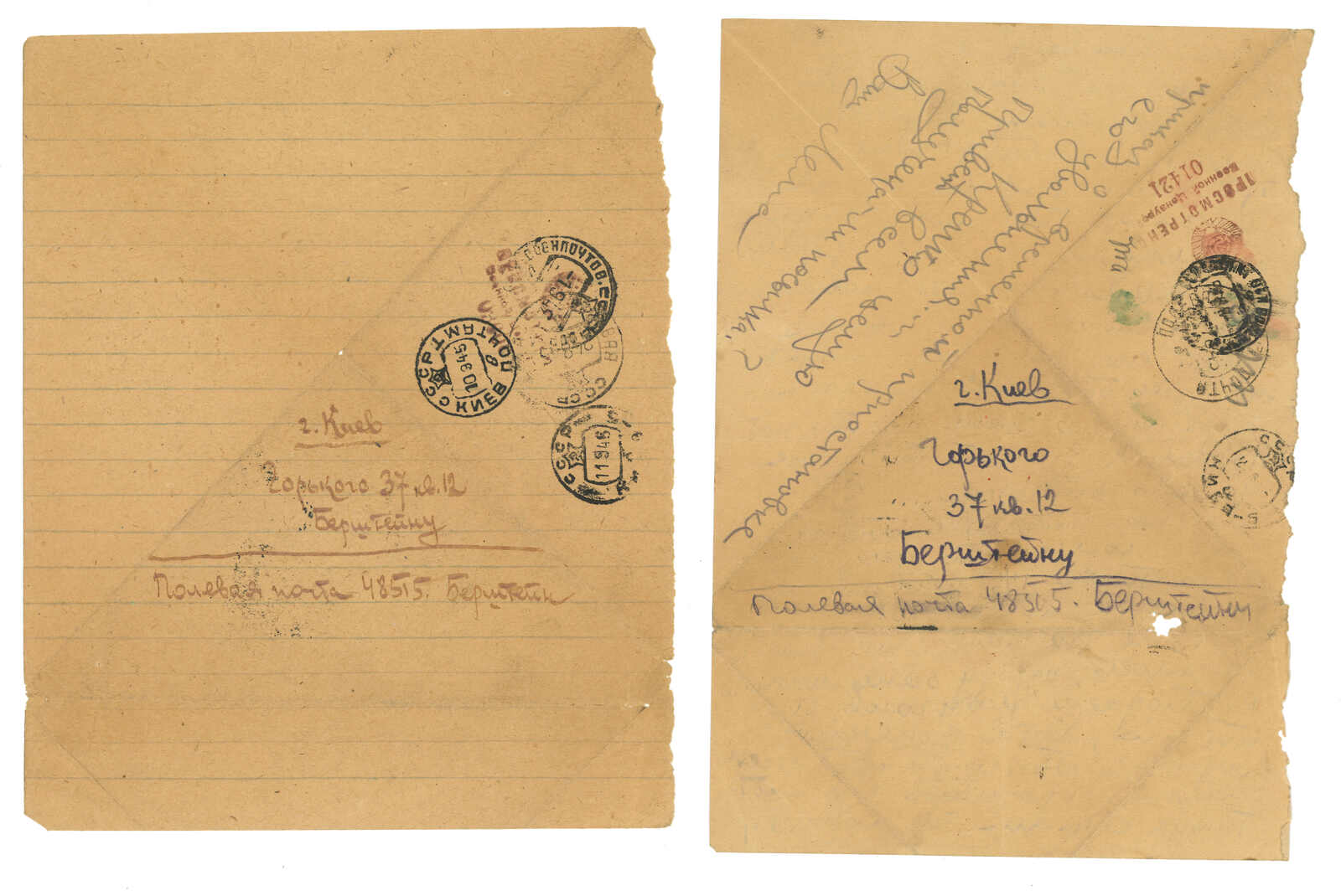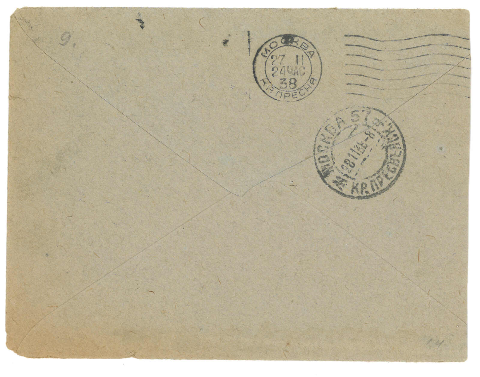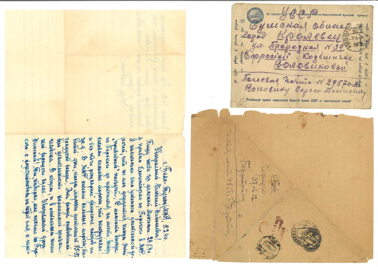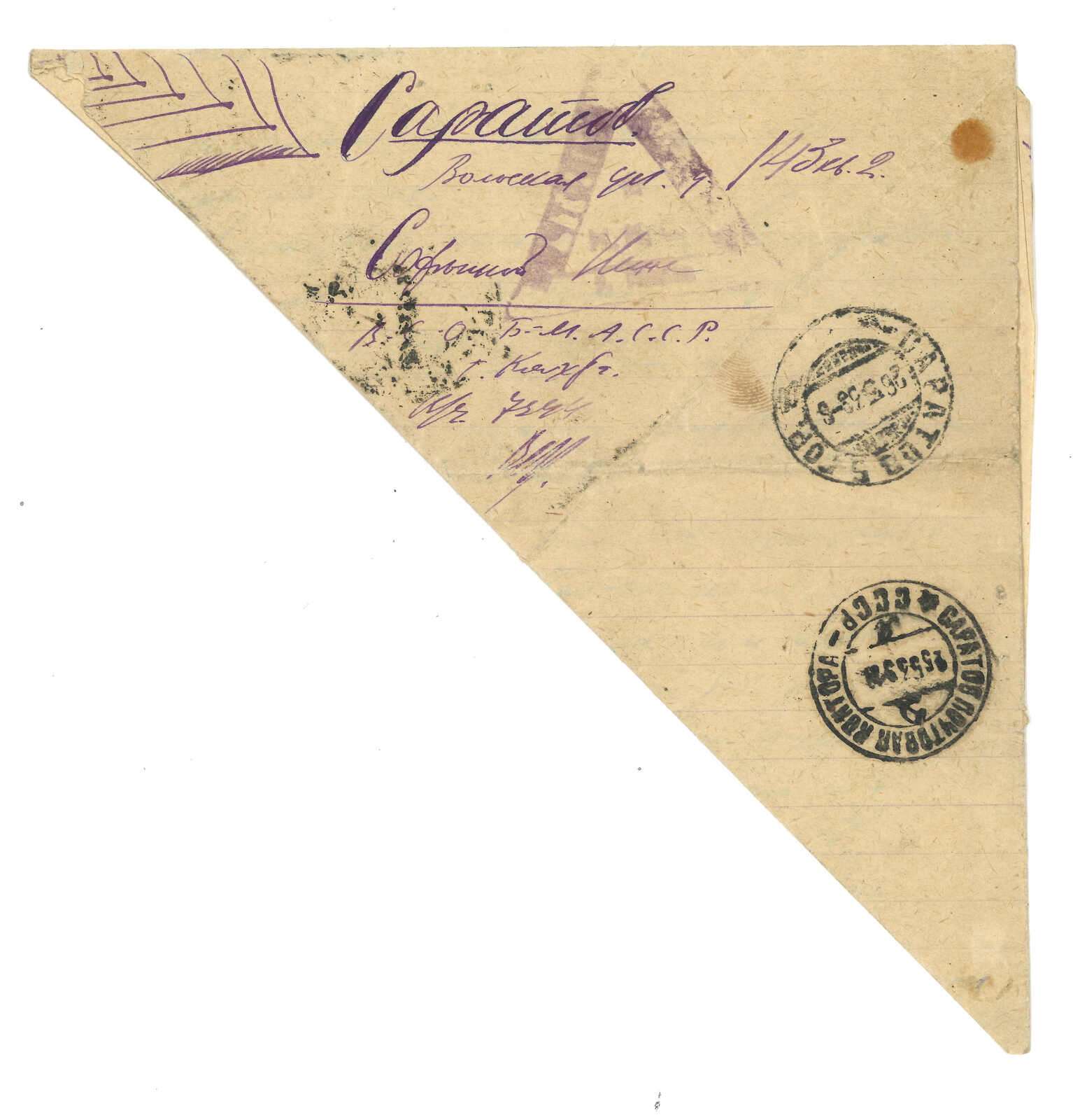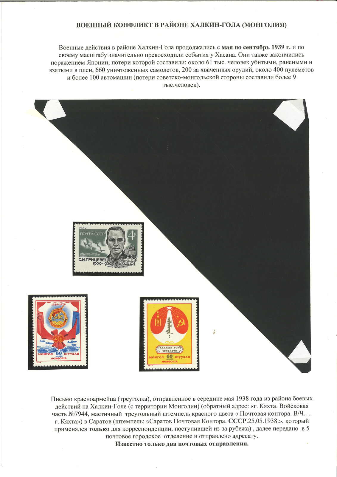 1938 (May) trianuglar cover from a red army soldier from Khalkin-Gol to Saratov, frankless, applied with triangular censor mark, origin and arrival cds. Plus 3 stamps on exhibit pages. Scarce example from Battles of Khalkhin