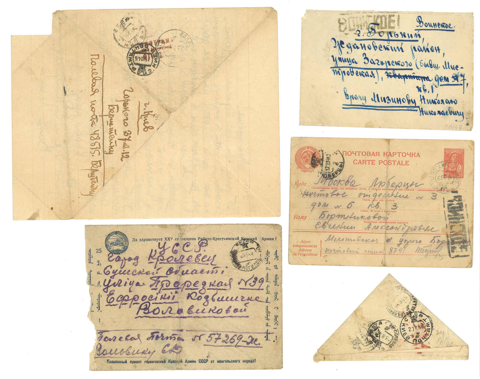 1939-1944 a group of 10 USSR military covers, cards and lettersheets from Mongolia, including mails from Bayan Tumen and Borzya, partly applied with "SOLDIER" cachet.