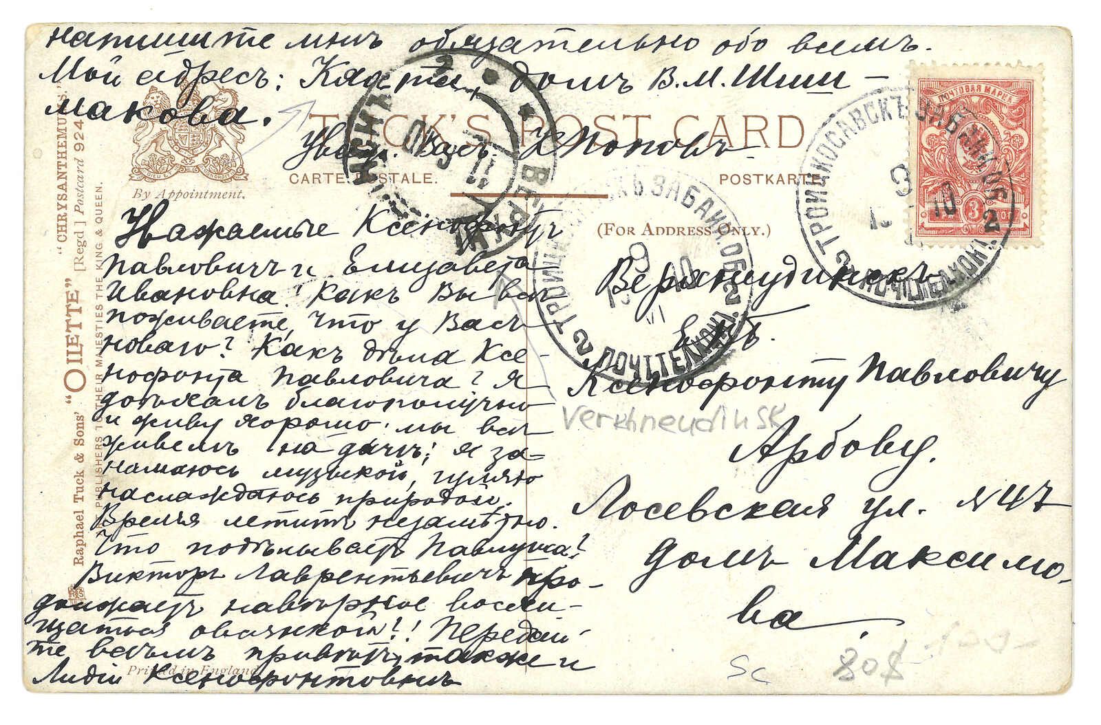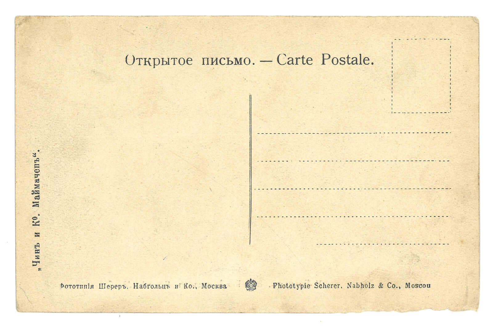 恰克圖寄上烏丁斯克。圖片明信片,貼軍徽圖3戈比,銷恰克圖俄局Hellrigl 2b型日戳。6.11抵上烏丁斯克。(Image 1)