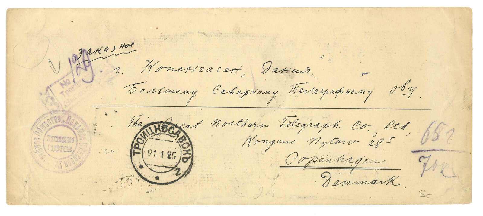 1925 Great Northern Telegraph Co, Troitskosavsky (21 Jan) to Denmark, f.w. USSR issue 30k + 40k on rerverse, tied by Troitskosavsky Hellrigl type 2 cds, matching with registered mark. Showing Great Northern Telegraph circular