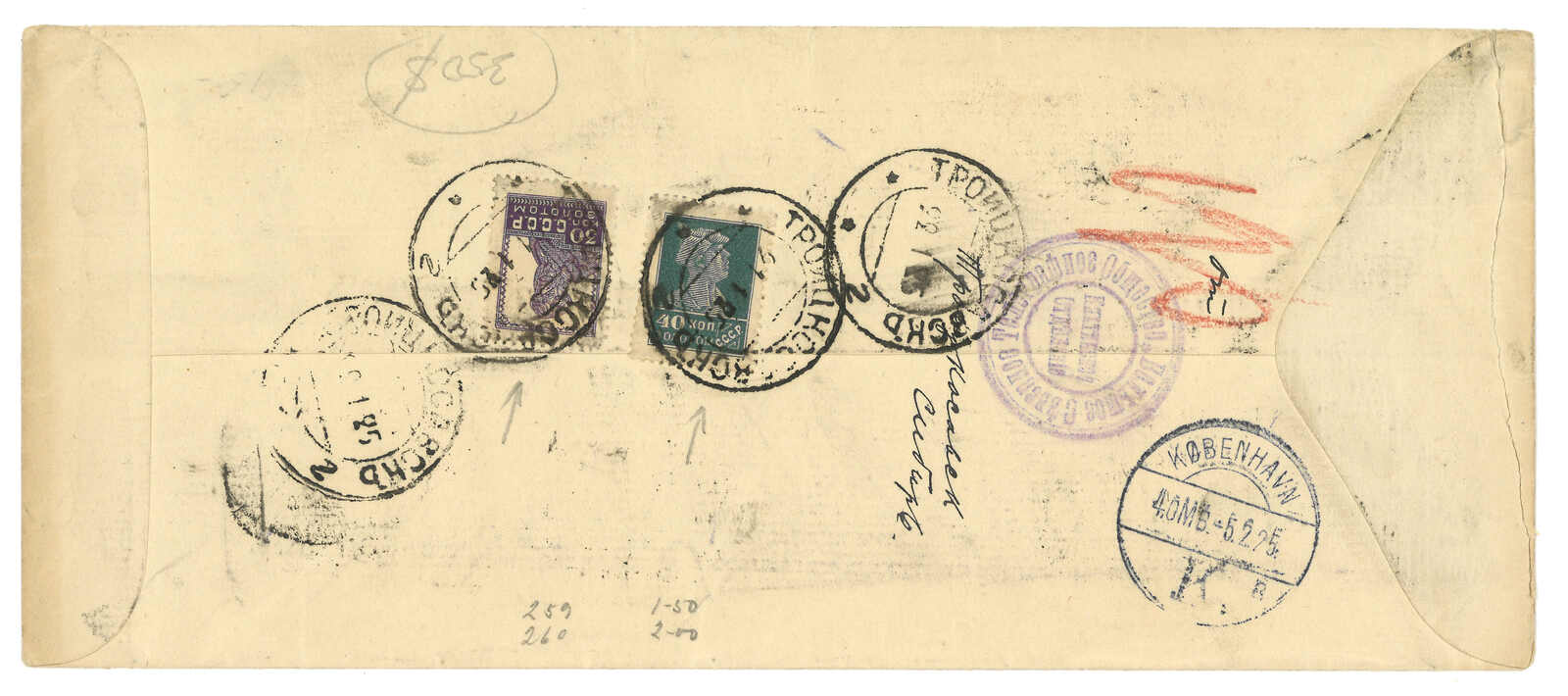 1925.1.21 由恰克圖大北電報公司寄丹麥,背貼蘇聯票30戈比 + 40戈比,銷恰克圖Hellrigl 2型日戳,另鈐掛號章及大北電報公司圓戳。2.5抵哥本哈根。(Image 1)