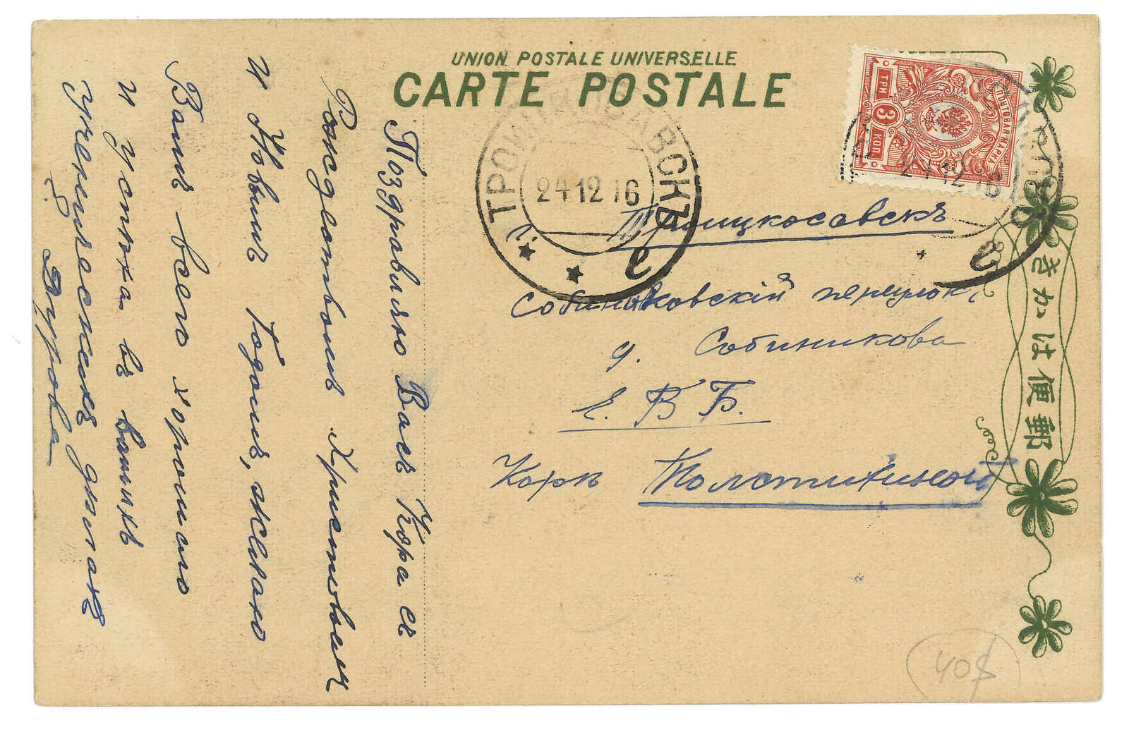 1916.12.24 恰克圖寄俄國。圖片明信片,貼軍徽圖3戈比,銷恰克圖俄局Hellrigl 2型日戳。(Image 1)