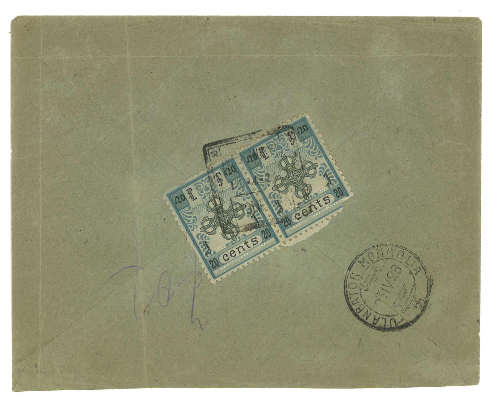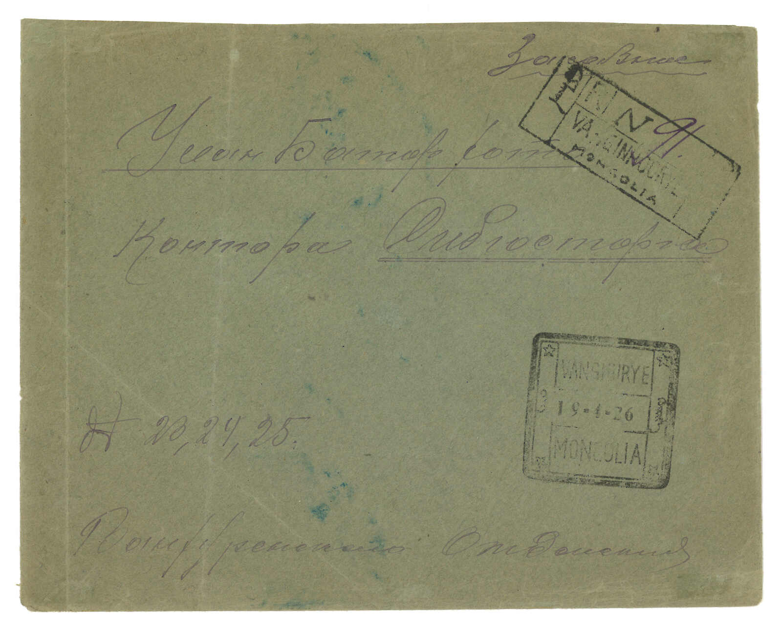 1926 (19 Apr) registered cover from Vanghurye, f.w. Mongolian 1st issue 20c in pair on reverse, tied by Vanghurye square d.s., matching with registered mark on front. Arrived Ulanbator (23 Apr).