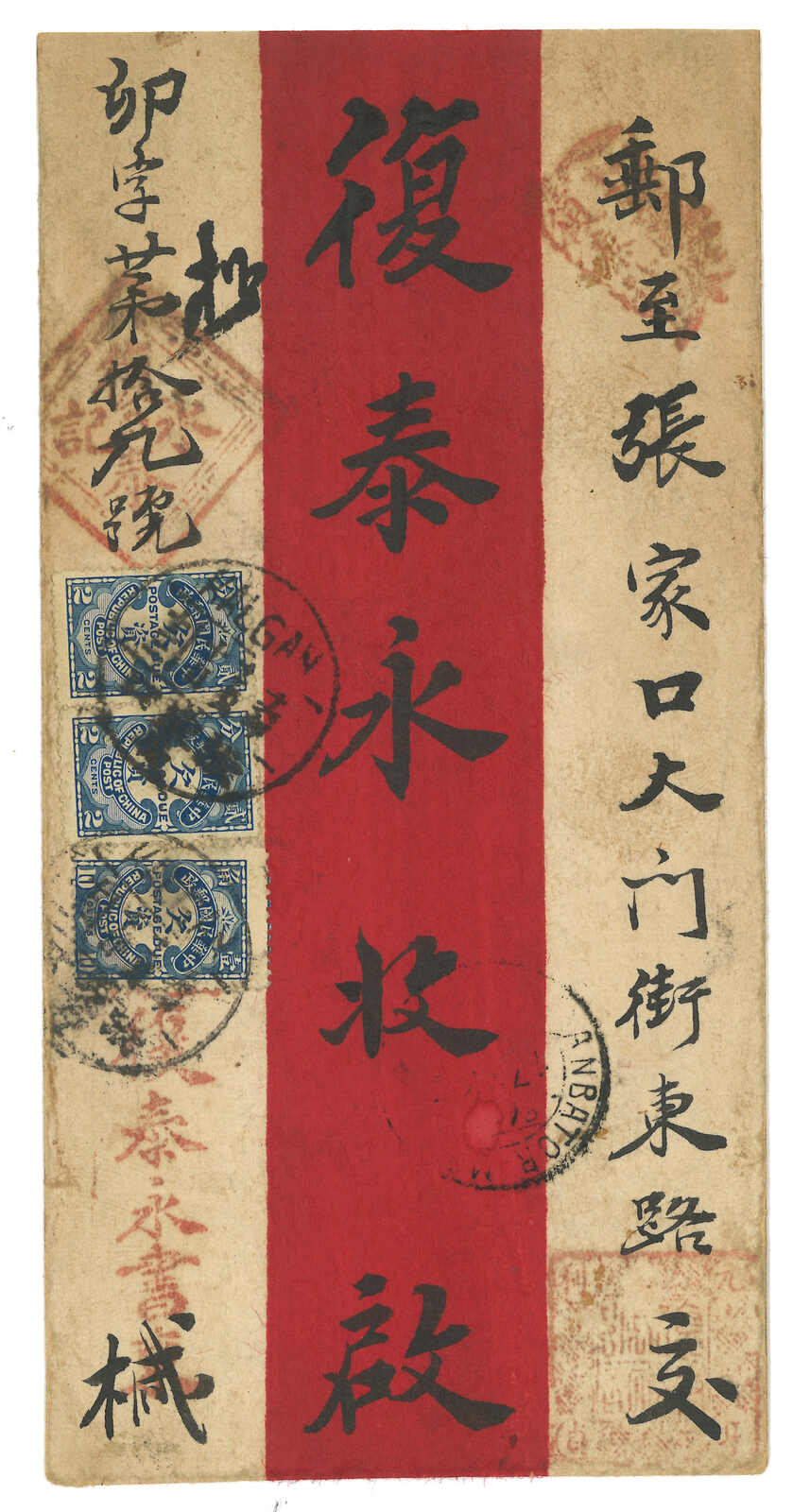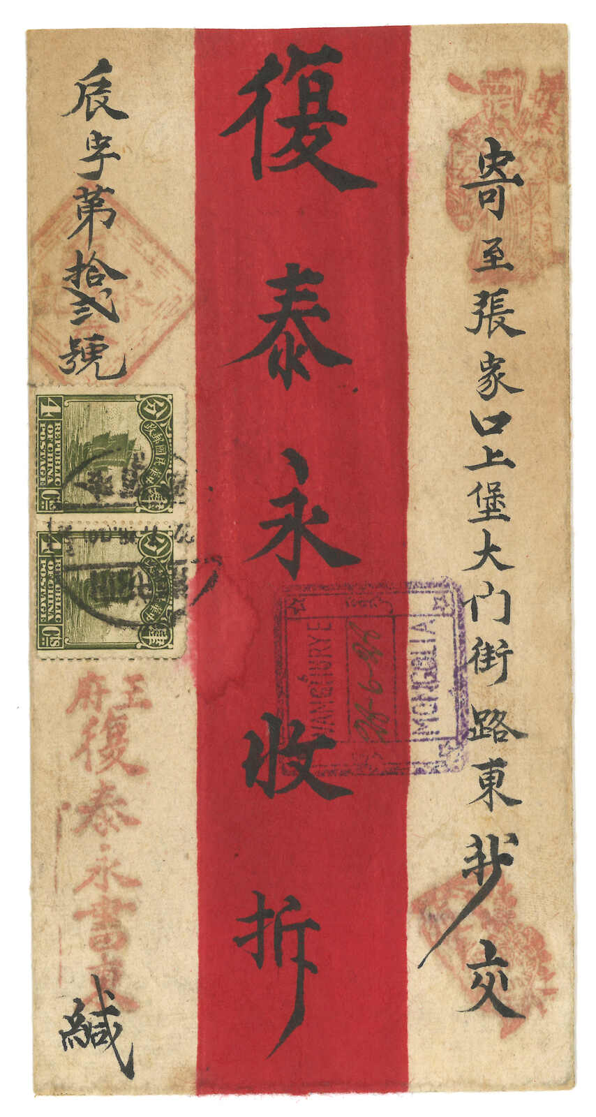 1927 Vanghurye to Kalgan. Red band cover, f.w. Mongolian 3rd issue 25m on reverse, tied by Vanghurye square d.s. in violet. In combination with Junk 1c in block of 4, tied by Harbin (10 Aug) cds. Arrived Kalgan.