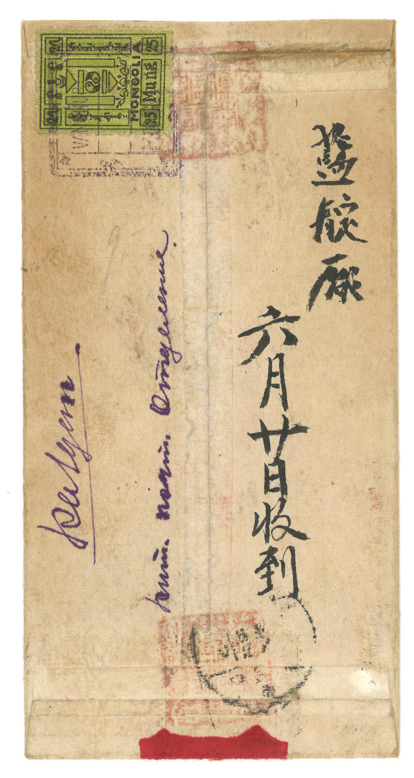 布爾干寄張家口。紅條封,背貼蒙古第三版25x2,銷布爾干方形紫色日戳,旁鈐掛號章。12.7經北京。正背分別加貼帆船1分 + 3分及欠資票2分x2 + 1角,前者以郵戳邊緣滾銷,後者銷張家口到達戳。Hellrigl著《The Postal History of Mongolia 1841-1941》第221頁圖156原件。(Image 1)