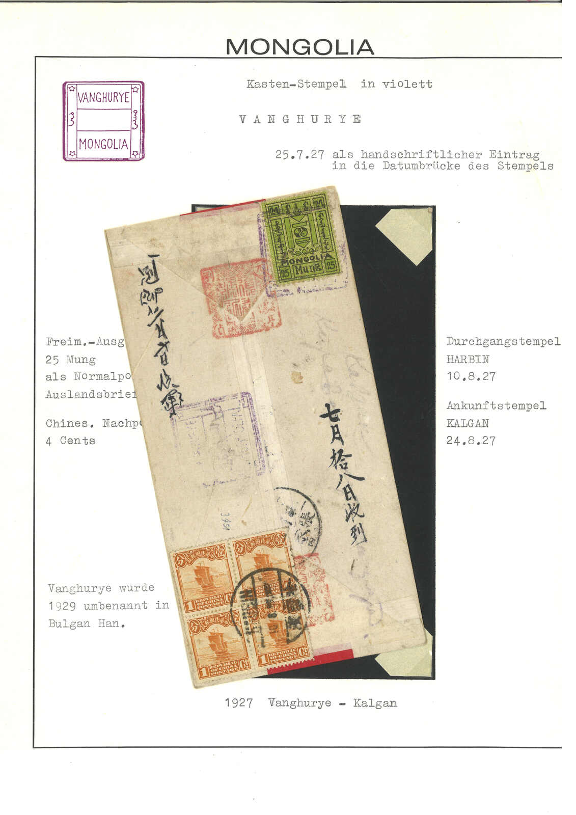 1927 Vanghurye (14 Nov) to Kalgan. Red band cover, f.w. Mongolian 3rd issue 25m x2 on reverse, tied by Vanghurgye square h.s. in violet, alongside with Vanghurye registered mark. Transit Peking (7 Dec). In combination with Junk