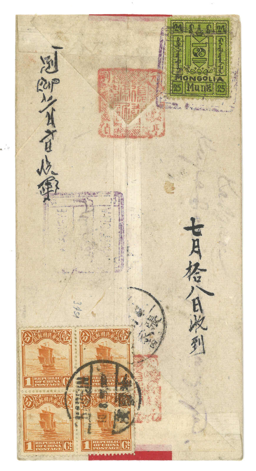 1926 Ulanbator (27 Mar) to Kalgan. Chinese style cover, f.w. Mongolian 1st issue 1c x5 + 10c + 50c on reverse, tied by Ulanbator cds. Transit Manchouli (4 Apr). In combination with Junk 3c in strip of 3, tied by the rim of