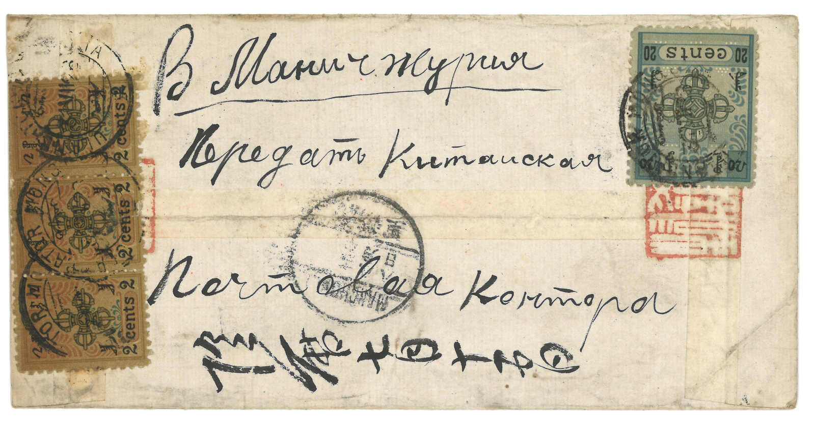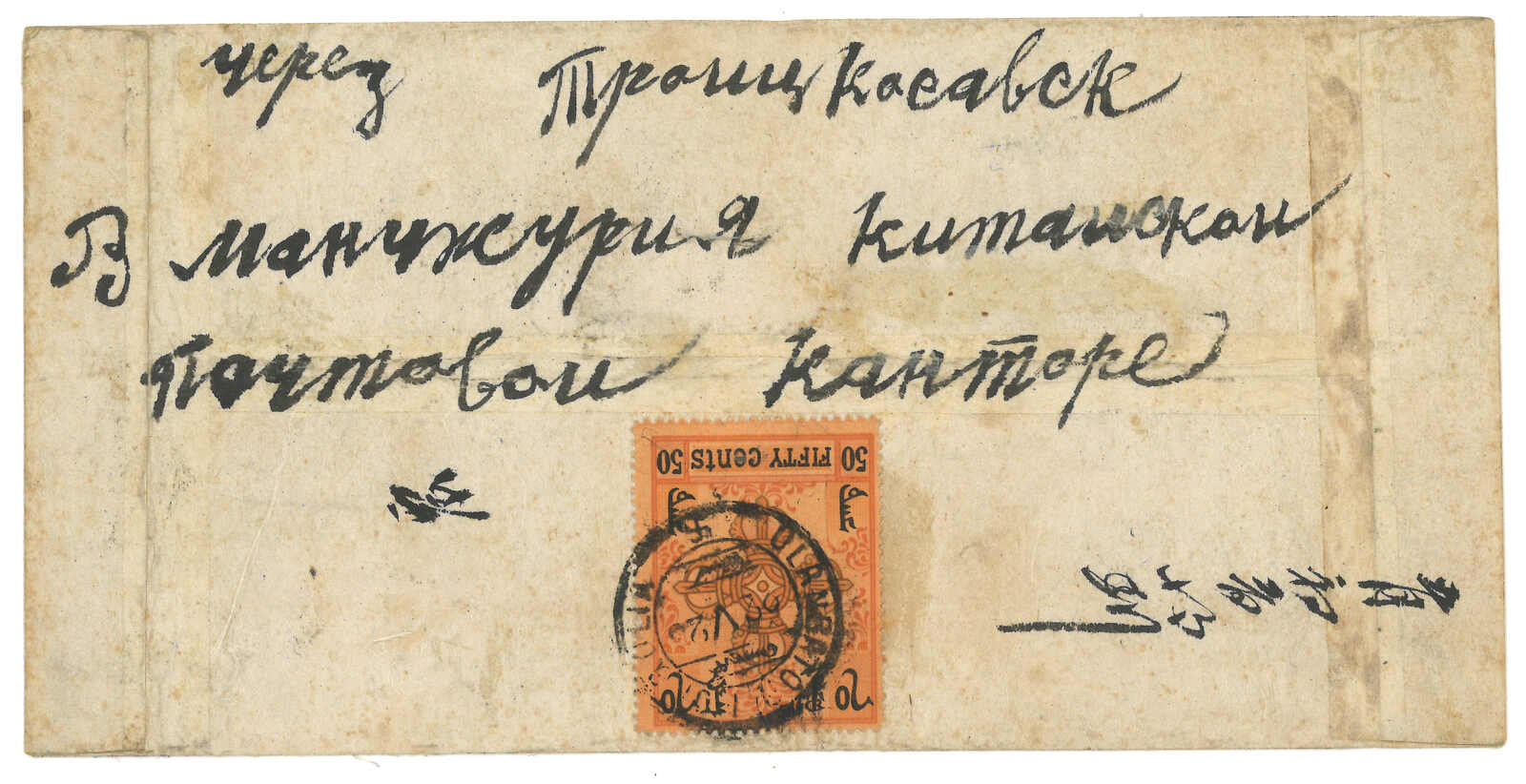 of Ulanbator PO. He produced imitative ovpt. "POSTAGE" stamps with genuine revenue stamps. One of the major receipients of Looshnikoff's fake cover was S.Kazakoff.