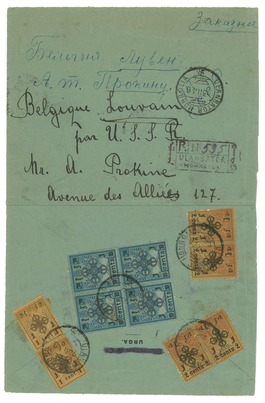 1926 Ulanbator (23 Feb) to Belgium. Registered cover, f.w. Mongolian 1st issue 1c in pair + 2c x4 + 10c in block of 4, in total of 50c, tied by Ulanbator cds., alongside with registered mark. Cover slightly reduced and opened