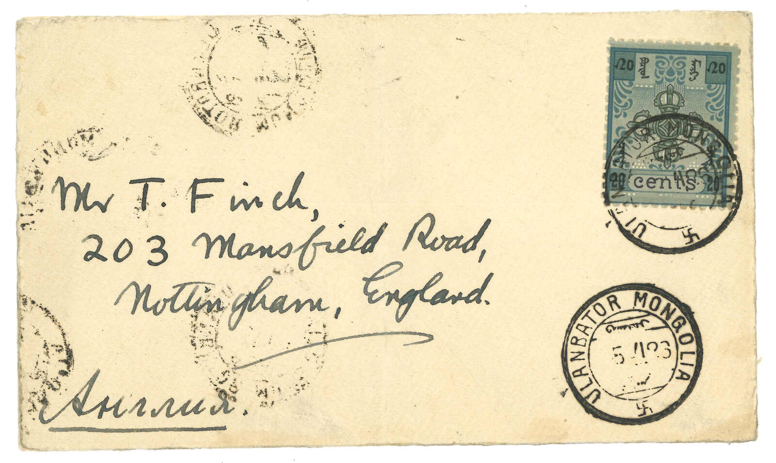 1926 Ulanbator (Apr) to England, f.w. Mongolian 1st issue 20c, tied by Ulanbator cds. Scarce destination.