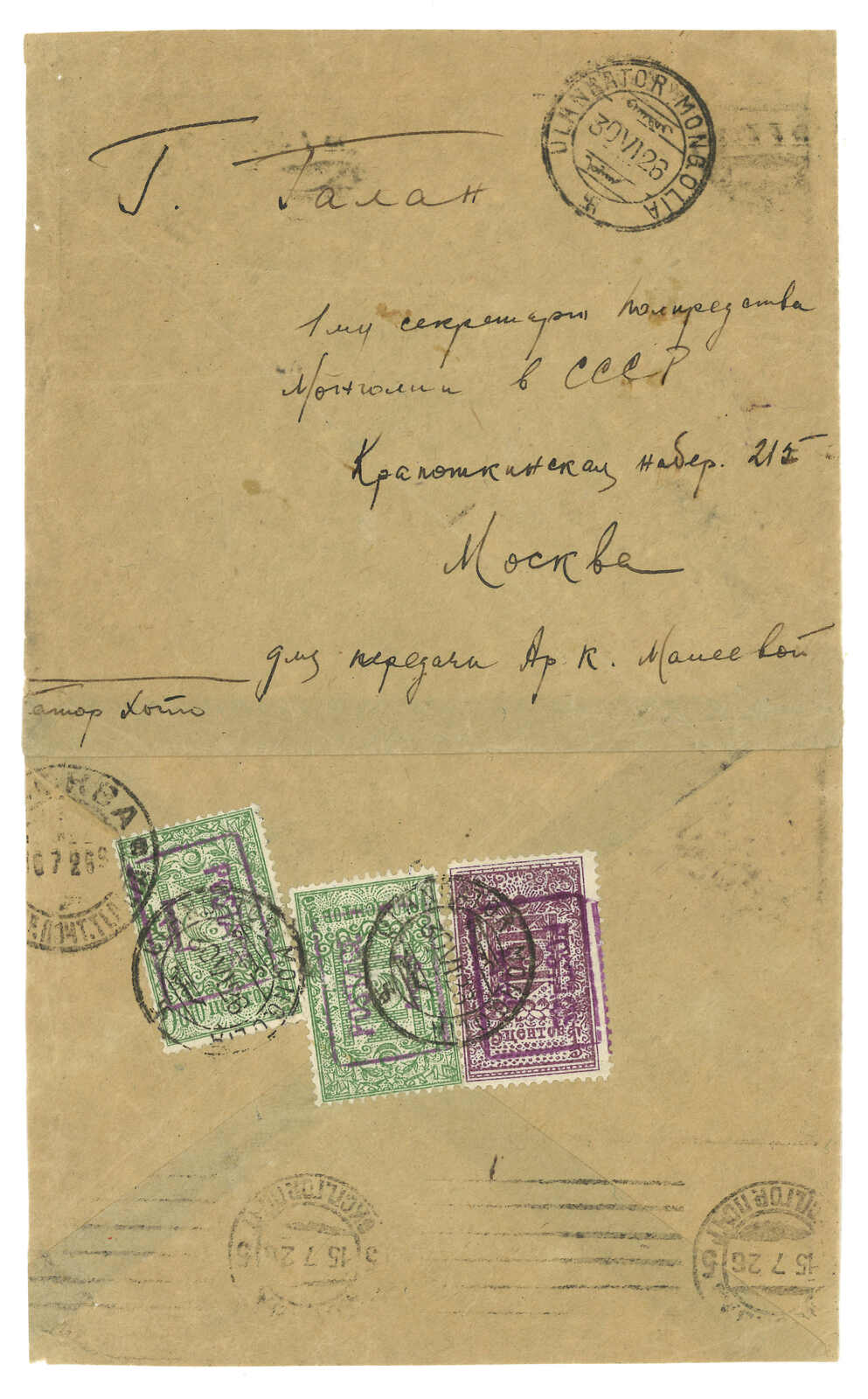 烏蘭巴托寄海參崴。掛號封,背貼印花稅票紫色加蓋“POSTAGE”50分3枚,合5倍郵資,銷烏蘭巴托日戳。正鈐掛號章。7.16抵海參崴。封剖開以作展示。為Hellrigl所記錄,12件貼用印花稅票加蓋“POSTAGE”50分實寄封之一,貼有三枚更是可遇不可求。(Image 1)