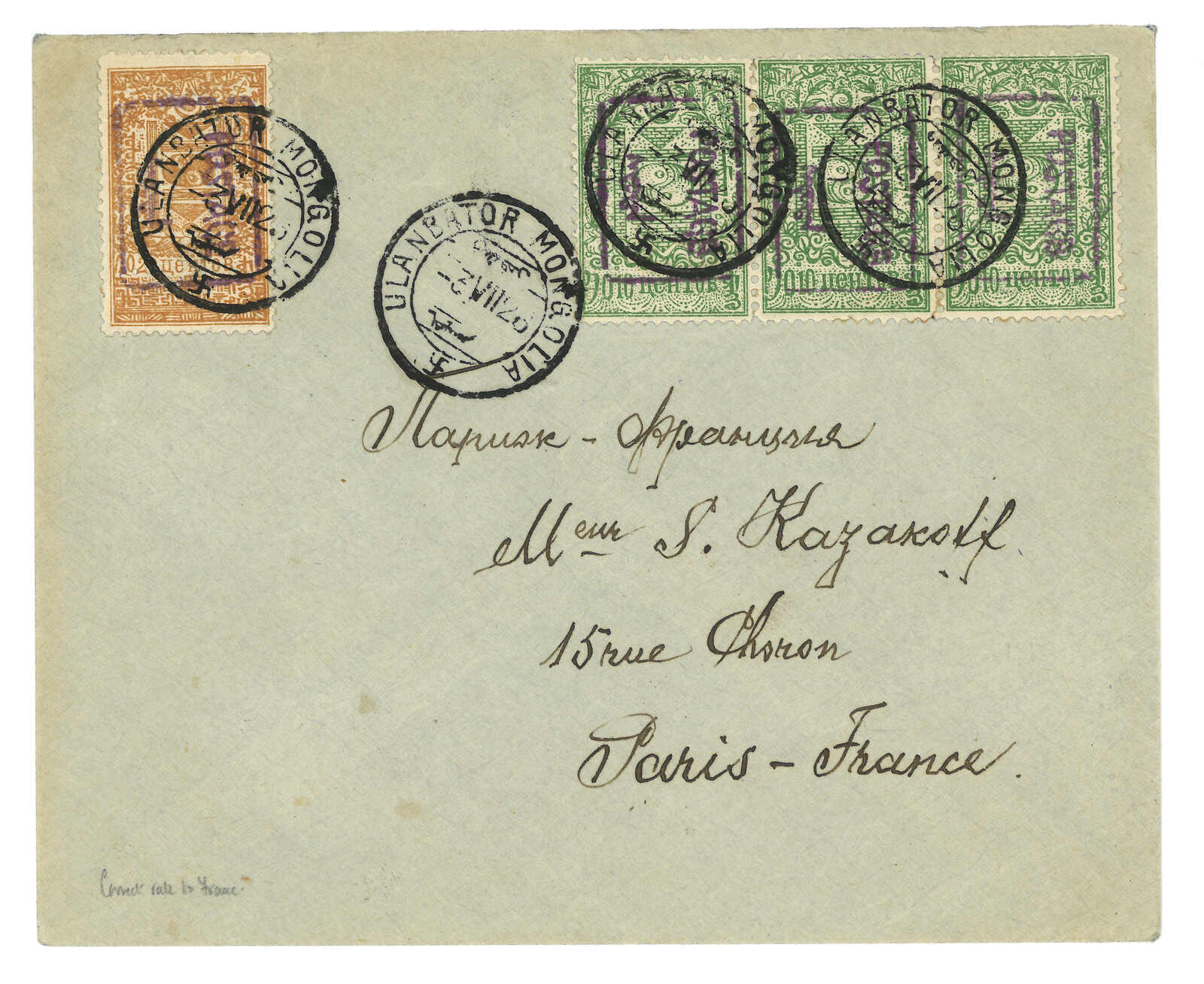 1926.7.3 烏蘭巴托寄法國S.Kazakoff,貼印花稅票紫色加蓋“POSTAGE”10分橫三連 +