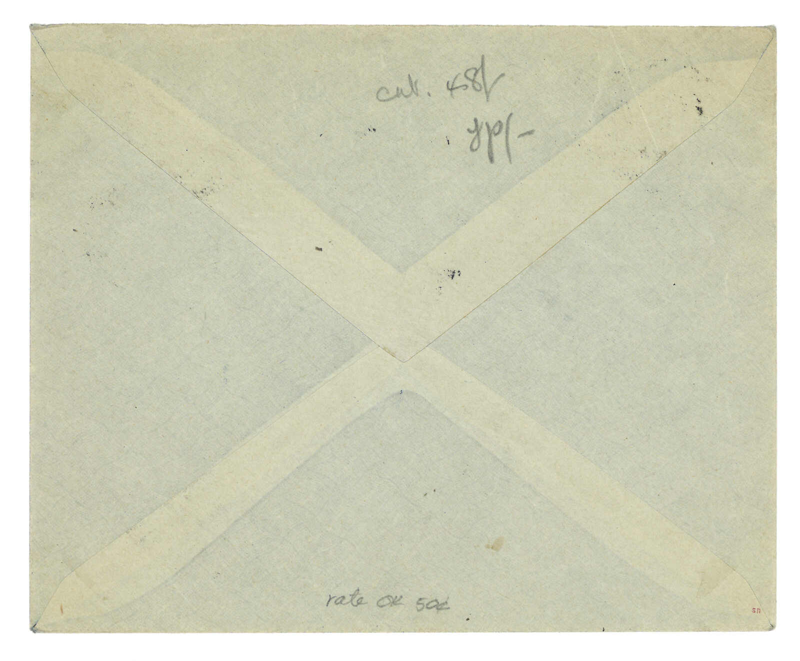 opened out for display. One of the 12 commerical covers f.w. revenue stamp ovpt. POSTAGE 50c. A great rarity.