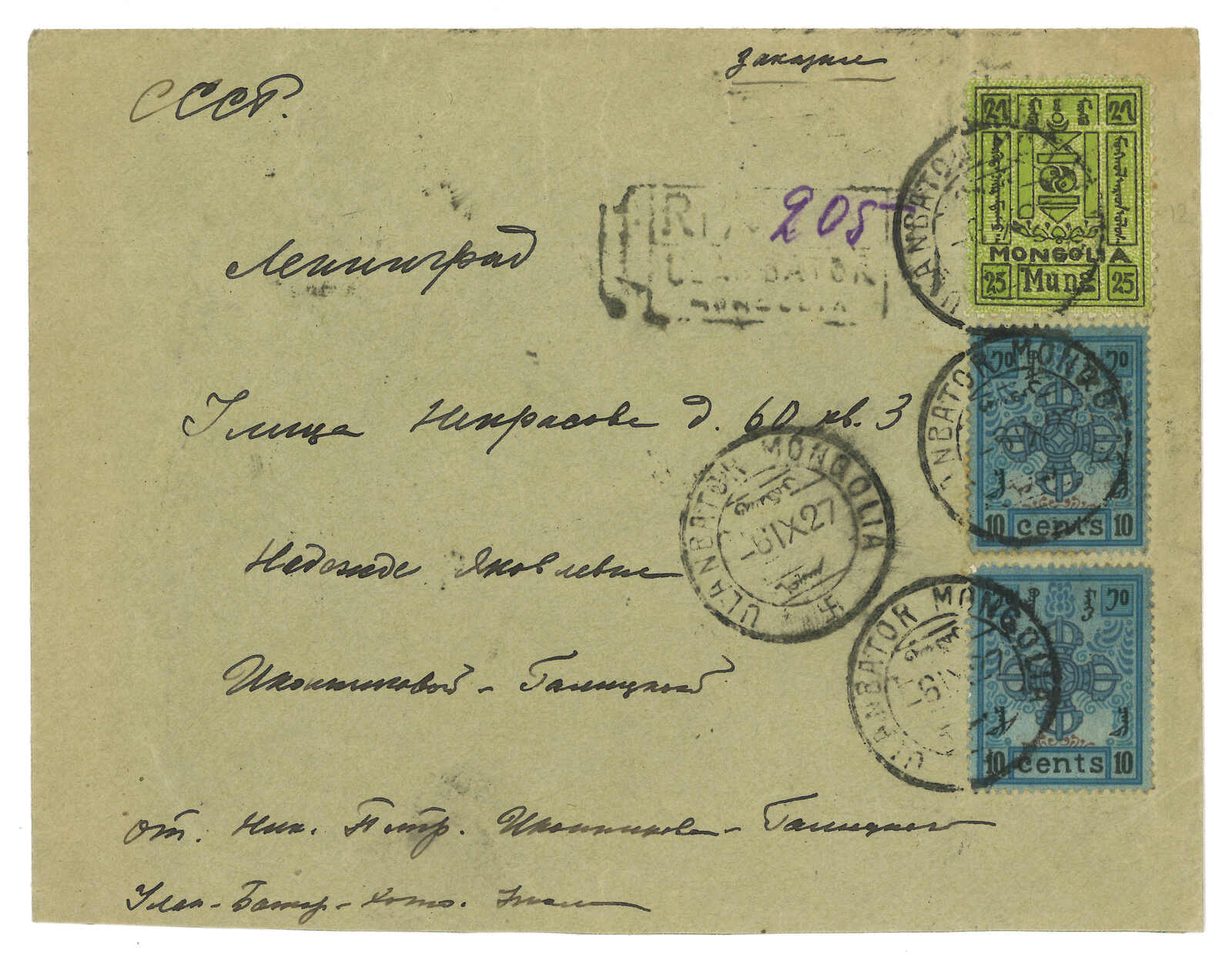1927 Ulanbator (6 Sep) to USSR. Registered cover, f.w. Mongolian 1st issue 10c x2 + 3rd issue 25m on front and 3rd issue 1m + 2m in pair + dropped stamp on reverse, tied by Ulanbator cds., alongside with registered mark.
