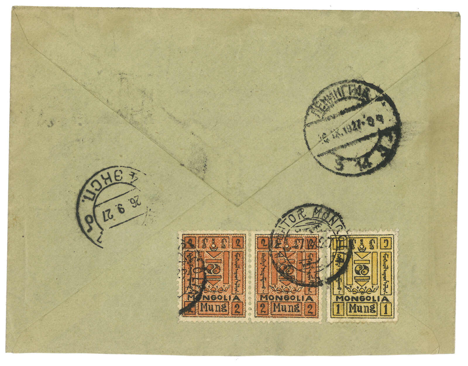 1927.9.6 烏蘭巴托寄蘇聯。掛號封,正貼蒙古第一版10分x2 + 第三版25m,背貼第三版1m + 2m雙連 + 掉票,銷烏蘭巴托日戳。正鈐掛號章。9.26抵蘇聯。第一版與第三版票混貼十分少見。(Image 1)
